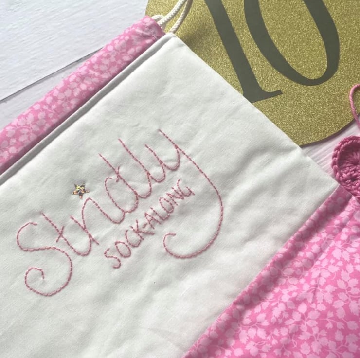 'Strictly Sock-Along' is hand stitched using DMC embroidery threads and the 'i' is embellished with a sparkly star sequin (Fab-u-lous, darling!)