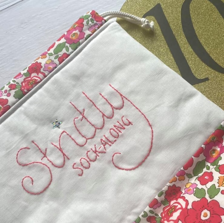 'Strictly Sock-Along' is hand stitched using DMC embroidery threads and the 'i' is embellished with a sparkly star sequin (Fab-u-lous, darling!)