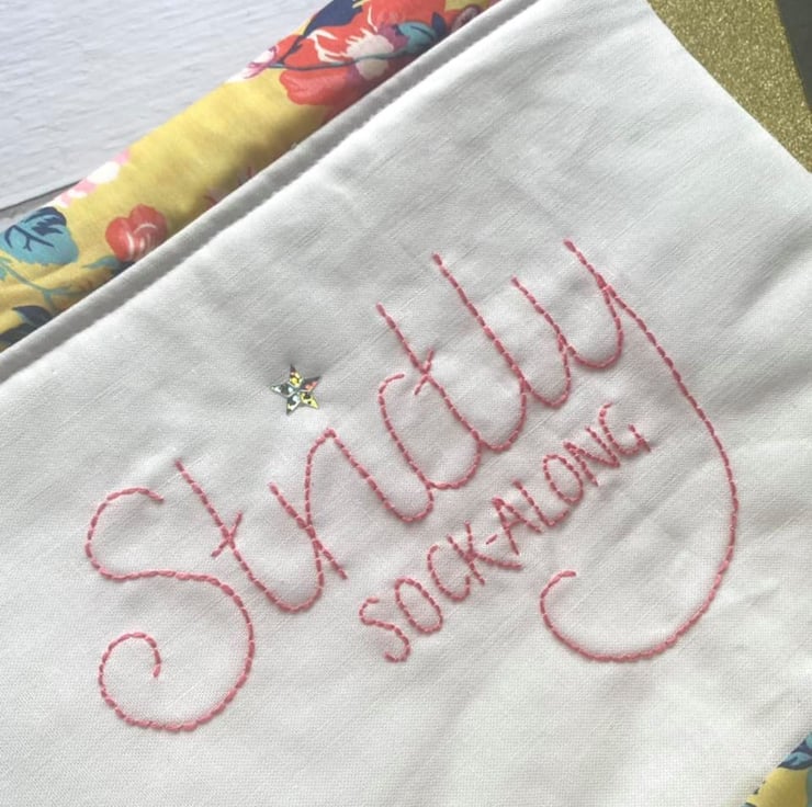 'Strictly Sock-Along' is hand stitched using DMC embroidery threads and the 'i' is embellished with a sparkly star sequin (Fab-u-lous, darling!)