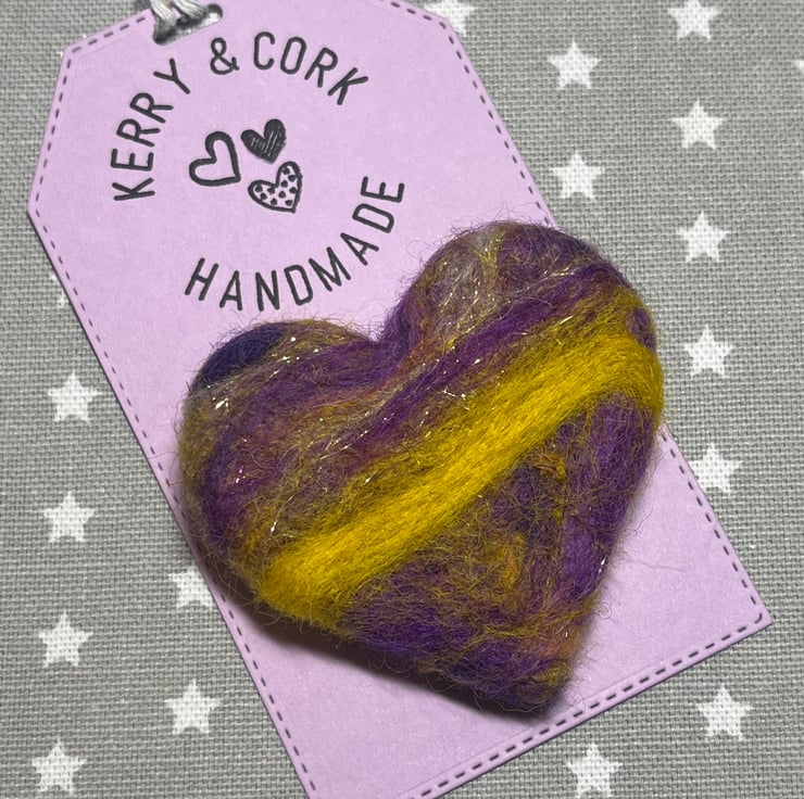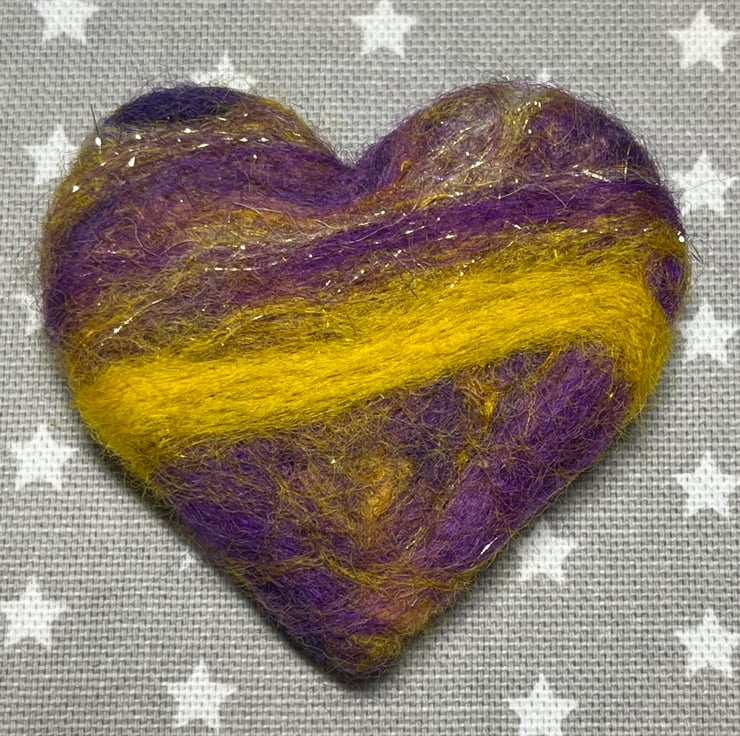 This needle felted brooch is made with Merino and Corriedale wool blended with subtle glittery strands, mulberry silk and bamboo. It’s 6 cms across its widest point and 6 cms top to bottom. Approx 1 cm thick. The brooch pin is sewn onto the back ( not glued )