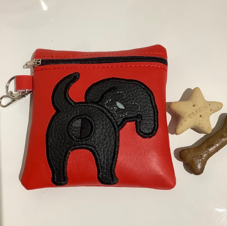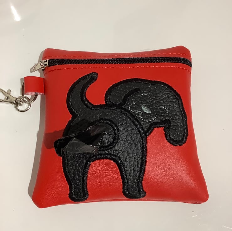 Attractive Labrador embroidered faux leather dog poo bag holder with strong metal lobster clasp and zip to enclose your dog poo bags , With a hole in the front to extract the bags safely