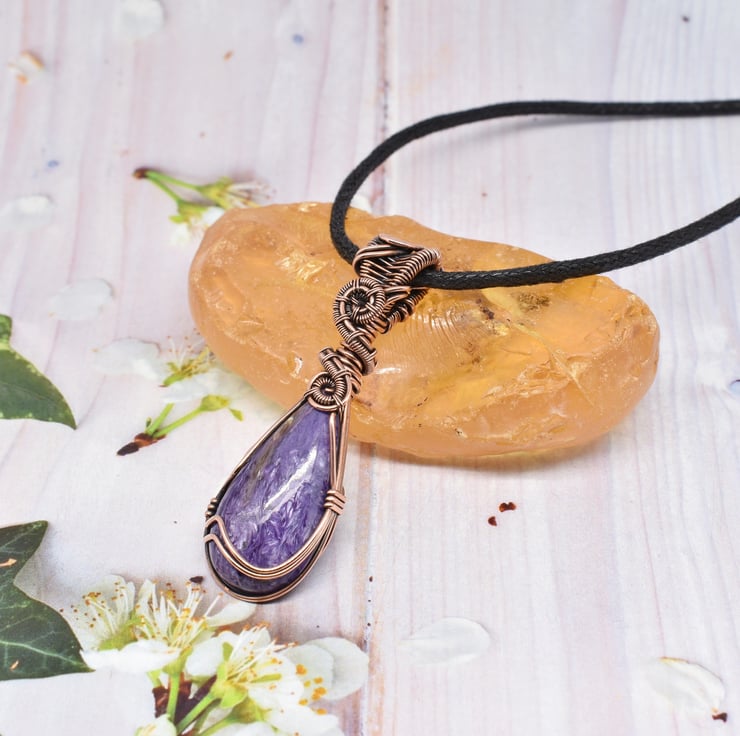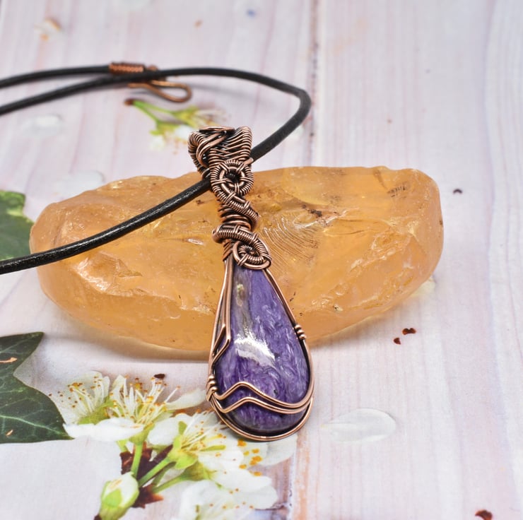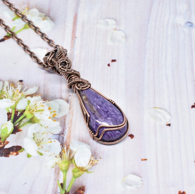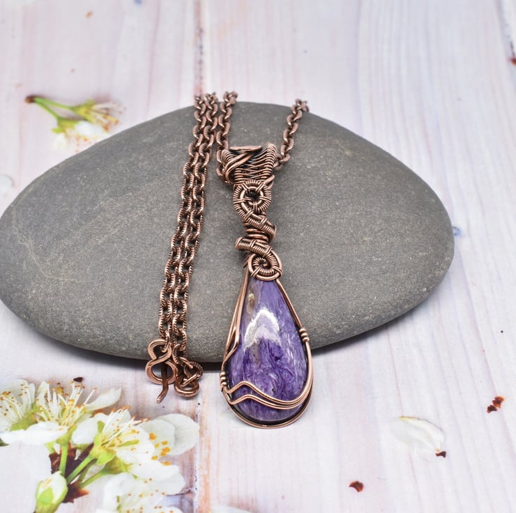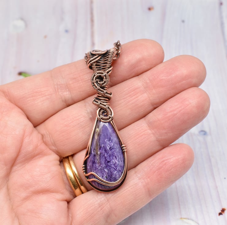 I wire wrapped this beautiful charoite using solid copper wire to make this stunning pendant which measures approximately 18 mm (11/16 inch) at the widest point and 56 mm (2 1/4 inches) to the top of the bail.
