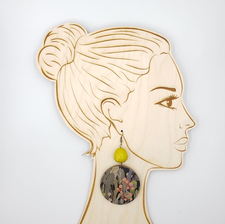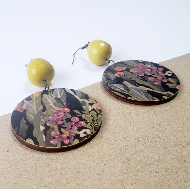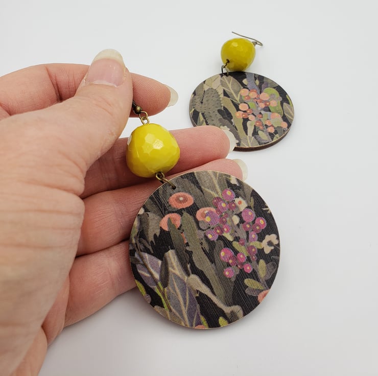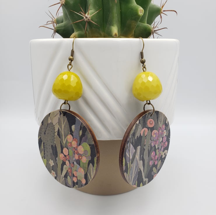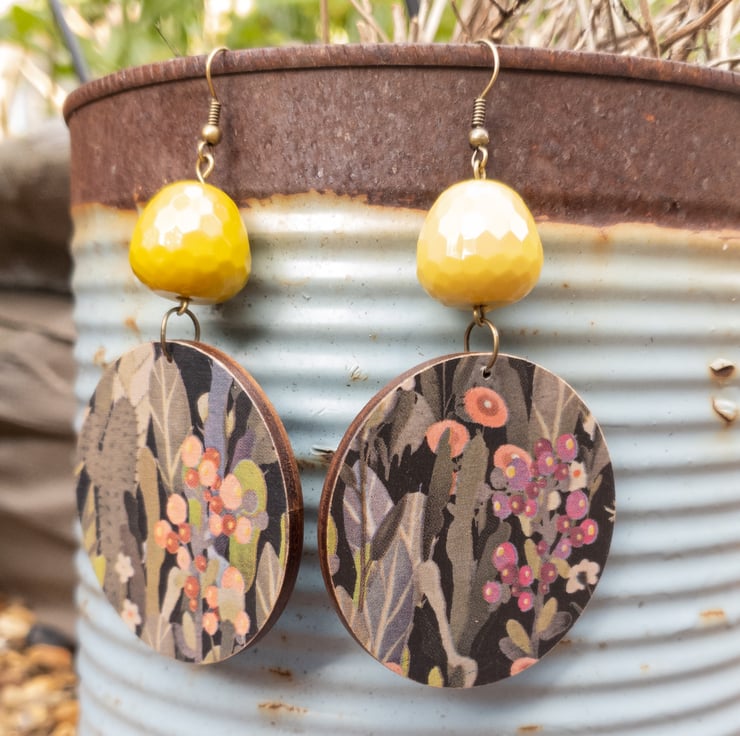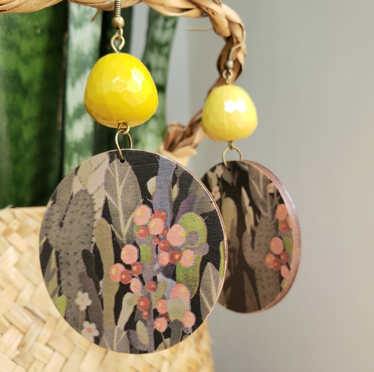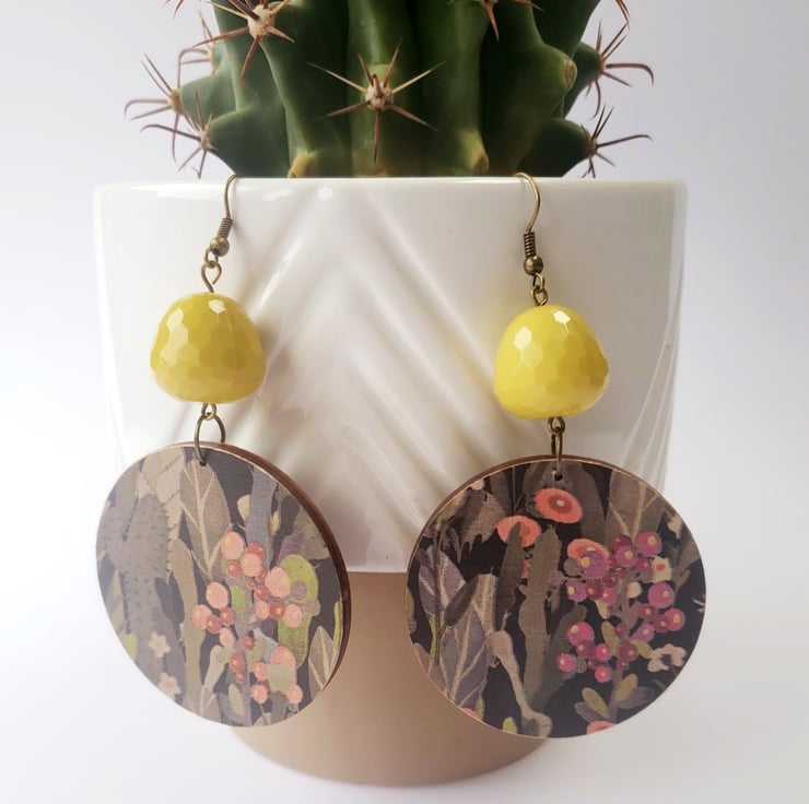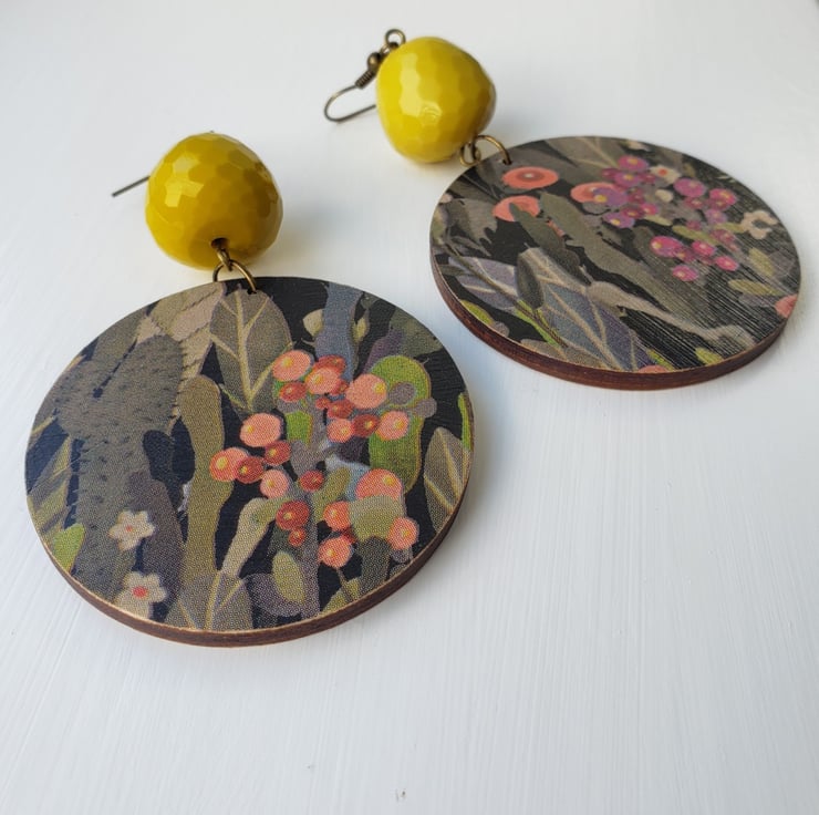 Another pair of these lovely cactus print earrings, but this time with gorgeous mustard coloured beads that twinkle in the light. I love the pattern of these earrings and the autumnal colours including pinks, greens, black and mustard. I've finished these earrings off with antique bronze hooks.