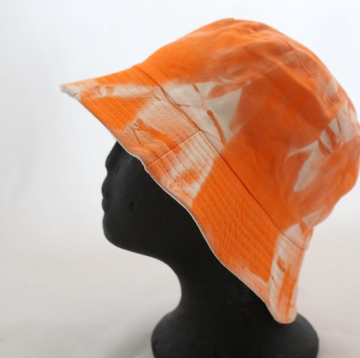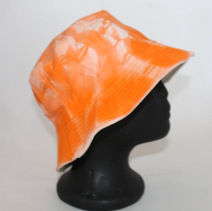 Tie dye bucket hat, an up cycled hat,hand tie dyed with an orange and light orange/white target style pattern,