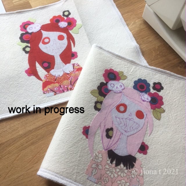 i individually hand-cut each tiny piece of cotton & linen fabric, and then (very patiently!) layer & applique them onto cotton calico to build up the image, before “drawing” the intricate details on freehand, using free motion embroidery.
