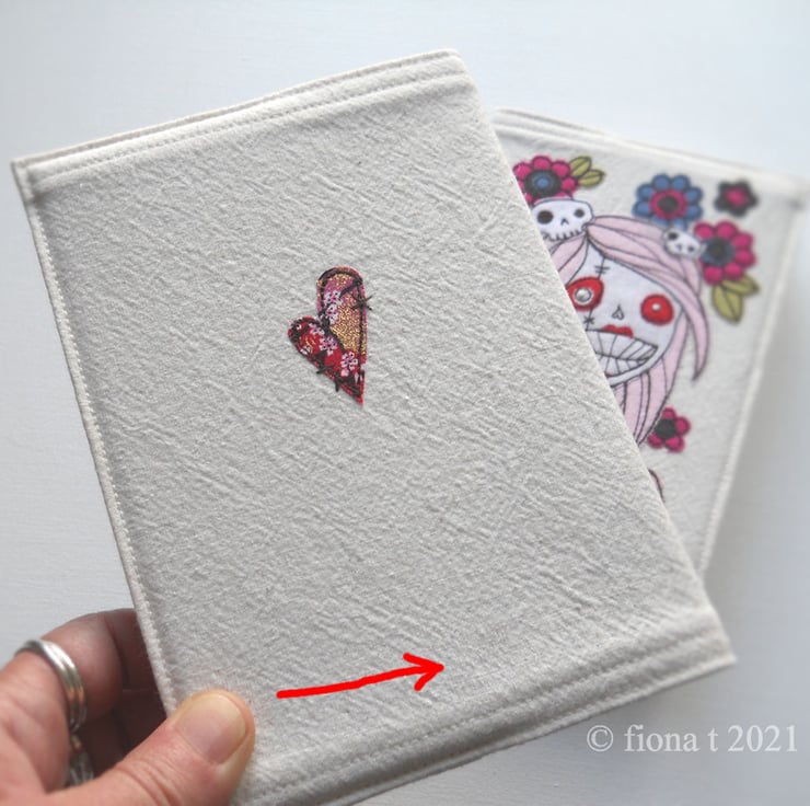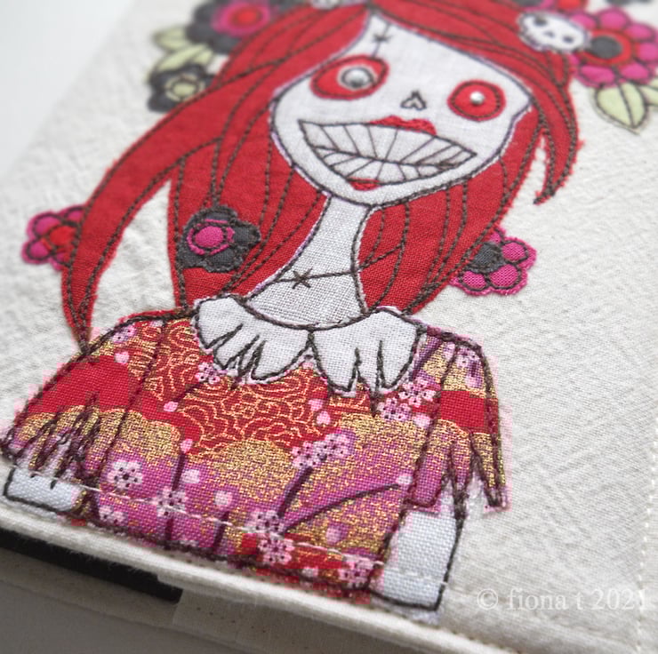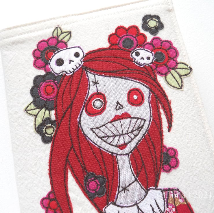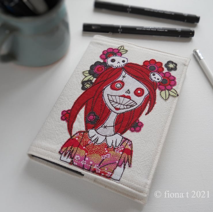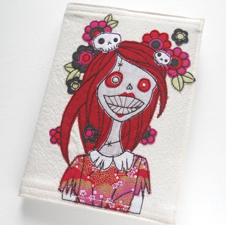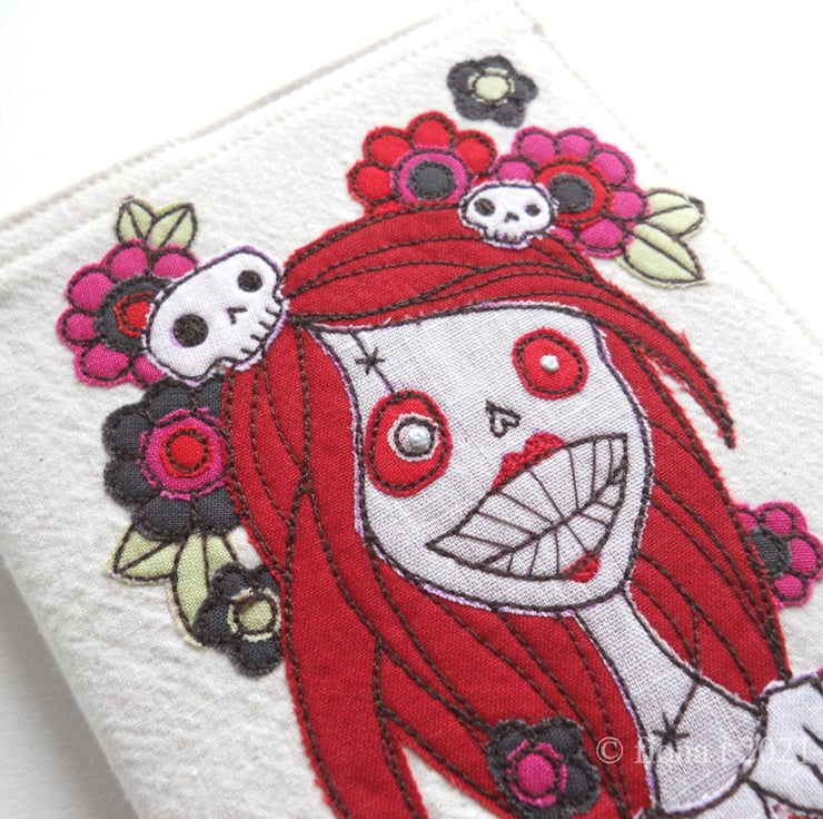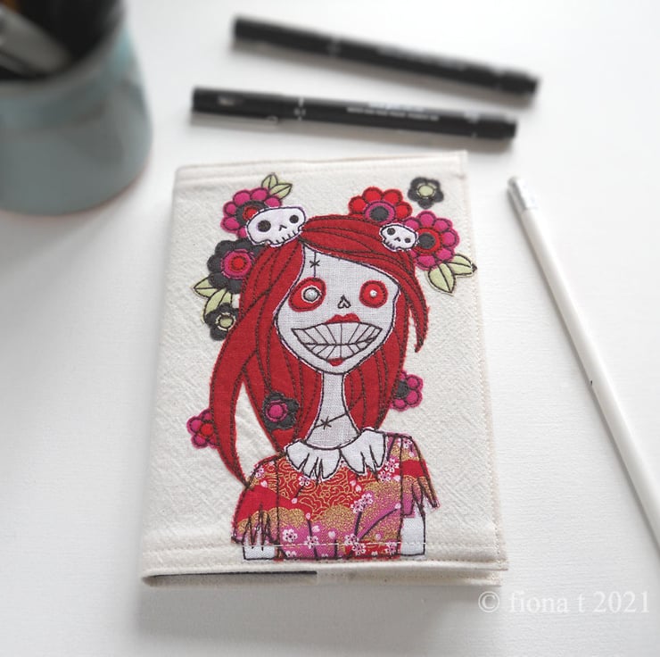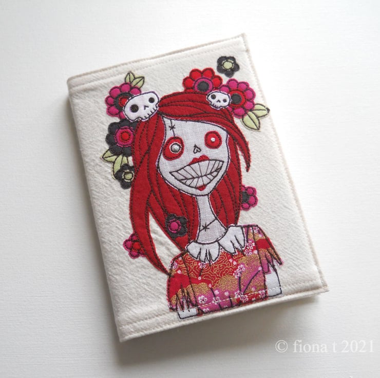 applique & freehand embroidered zombie notebook cover with A6 sketchbook inside.