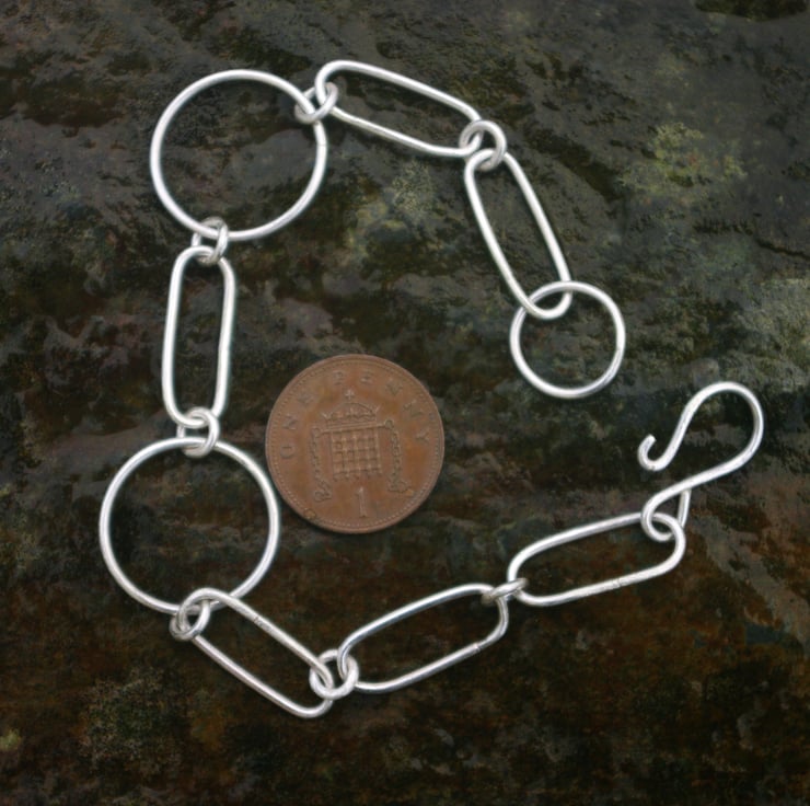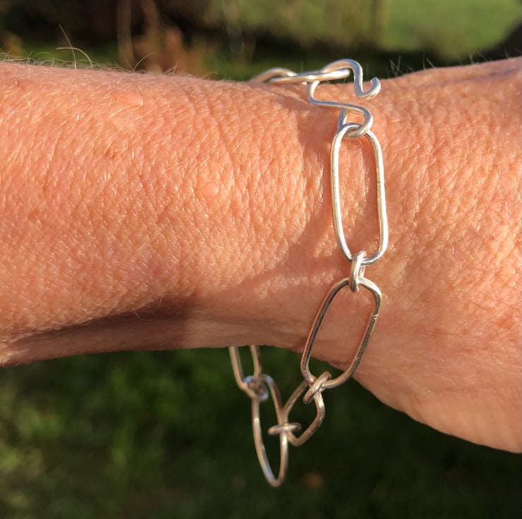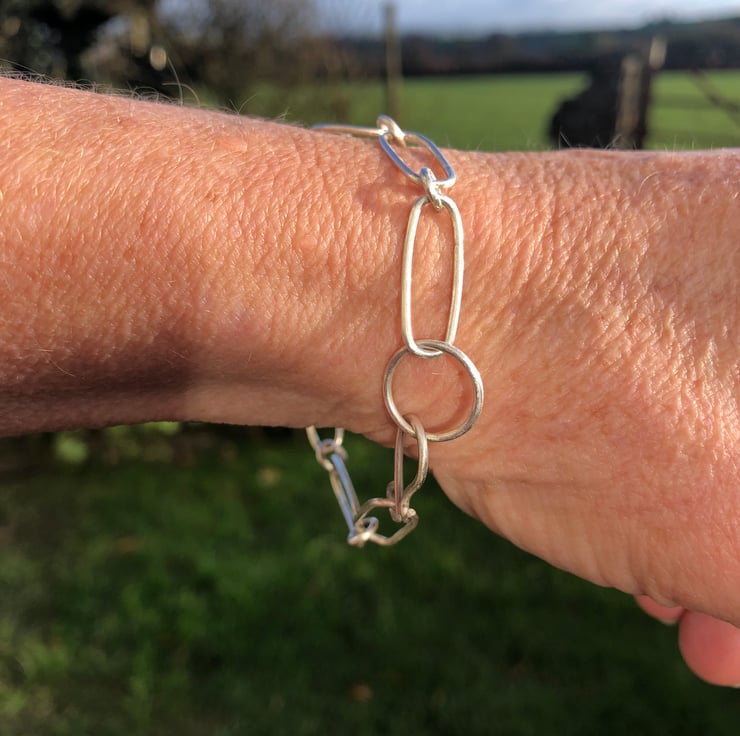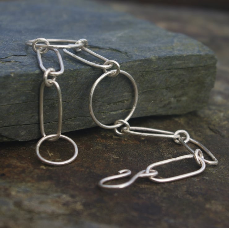 A silver chain link bracelet . The links are elongated and made with eco sterling silver wire They are joined with small circular links including 2 larger circles. All links are soldered closed and the fastening is a handmade S clasp.