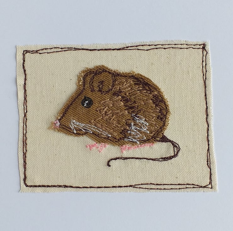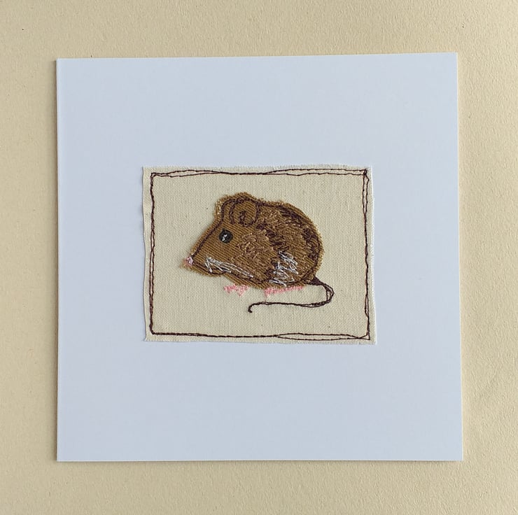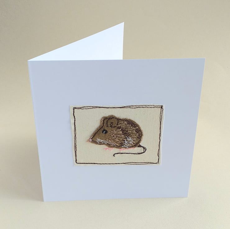 A cute little card depicting a field mouse made with fabric appliqued and stitched using free motion embroidery.