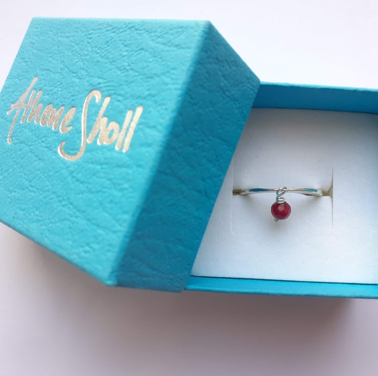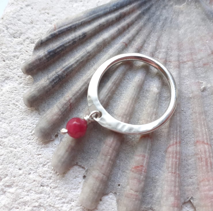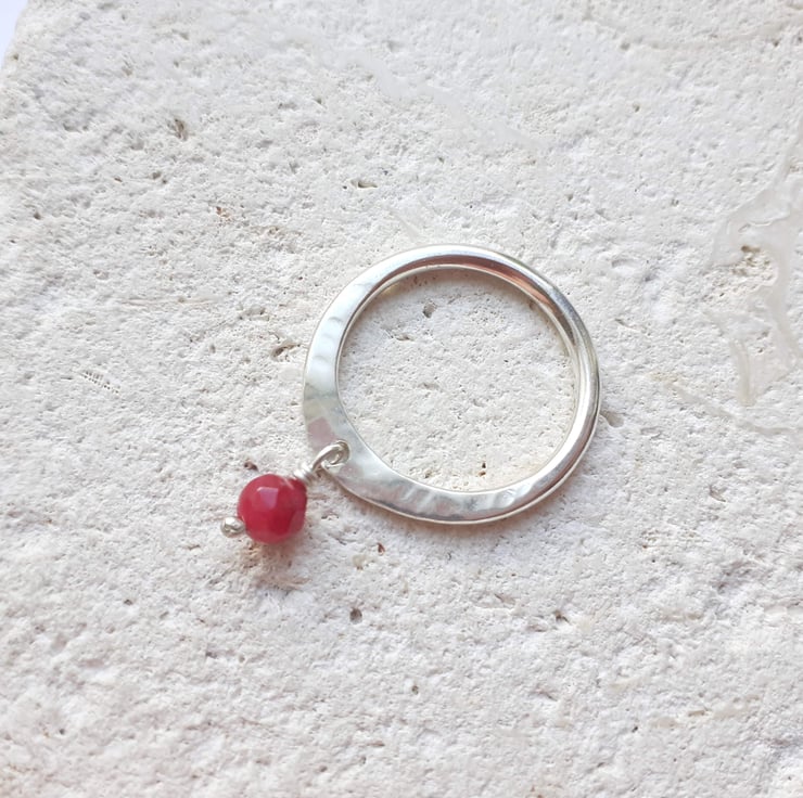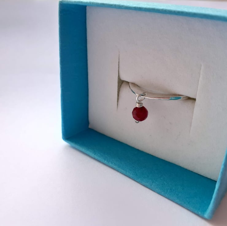 Lovely Sterling Silver ring with a dainty Ruby dangle stone
