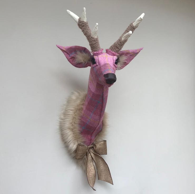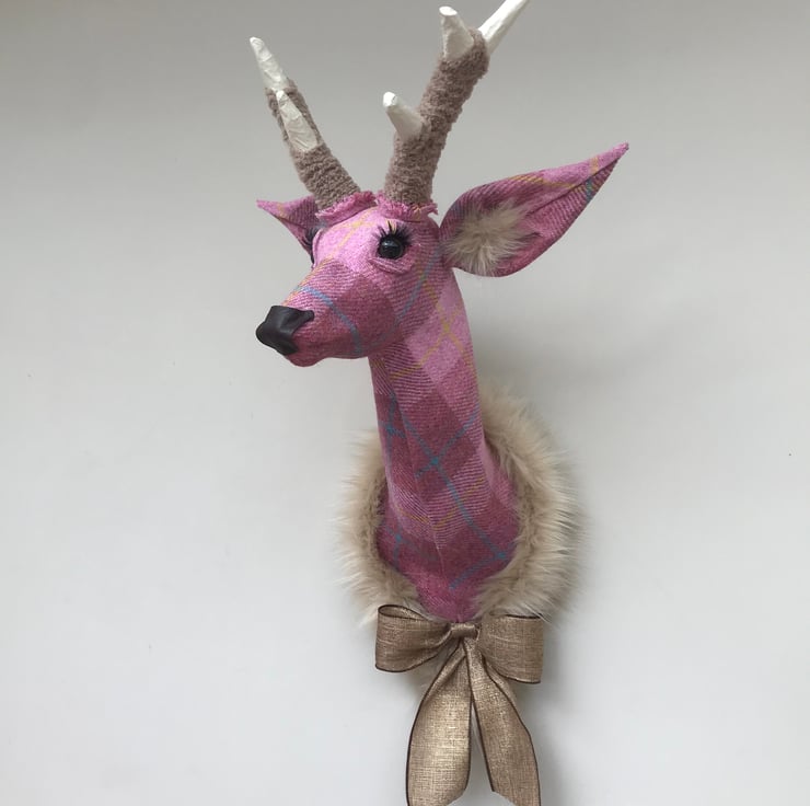 Welcome to my listing of a gorgeous Harris Tweed rose pink check handmade stag head. An elegant stag with a more natural appearance, with its slightly curved and elongated neck, a statement piece for any wall.