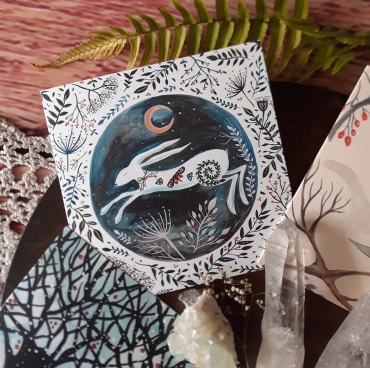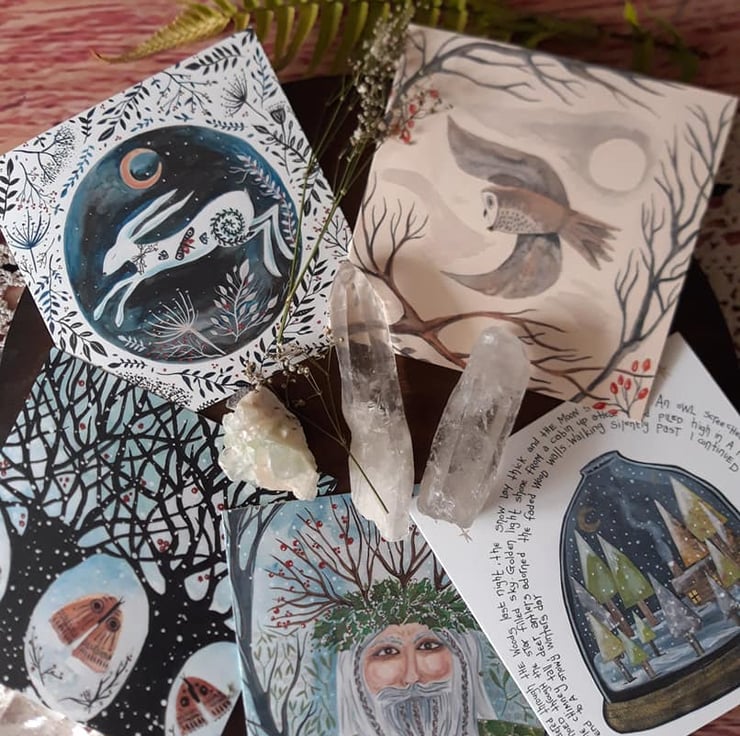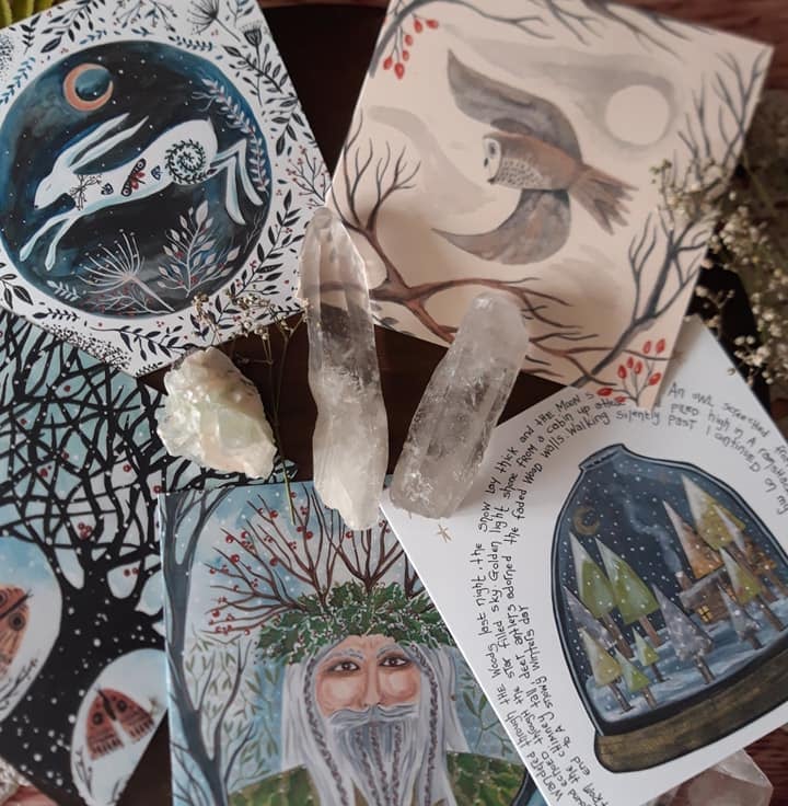 A lovely pack of 5 cards of my winter artworks.Lovely for Yule,winter wishes,use as notelets etc.