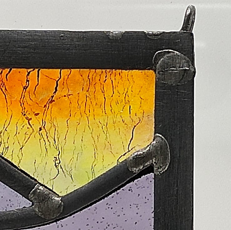 Once cut, the panel is then leaded, soldered and cemented. Hooks have been added for hanging this piece in your window.