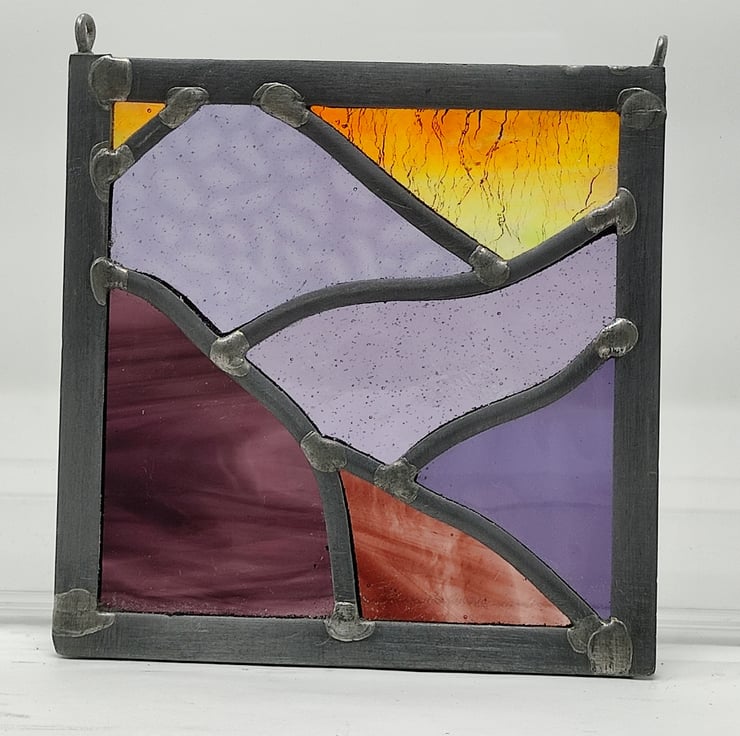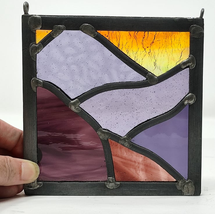 This study is all about the orange sunset sky with the warm purple mountains. The iridescent yellow/orange glass has a gorgeous red swirl through it giving a graduated sky. Three different blueish purples with different textures form the mountains in the distance, the foreground meadow and river have much redder purples.