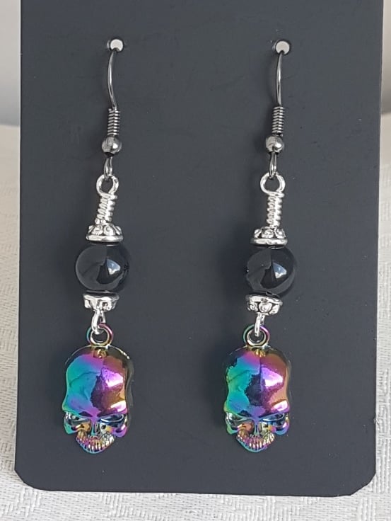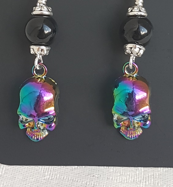 Rainbow Skull Earrings with Black Onyx Beads.