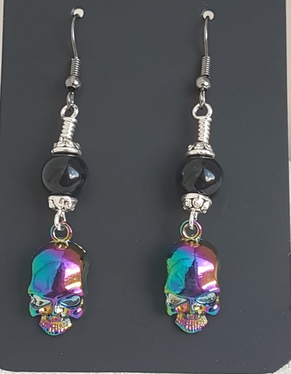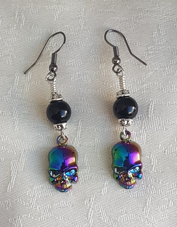 These are the epitome of Creepy Cute. Gorgeous Rainbow tone Skull Charms and fabulous Black Onyx beads make these spectacular little earrings to die for! Gorgeously Gothic with a modern rainbow twist. Great as a Spooky gift or as an everyday piece.