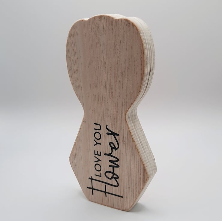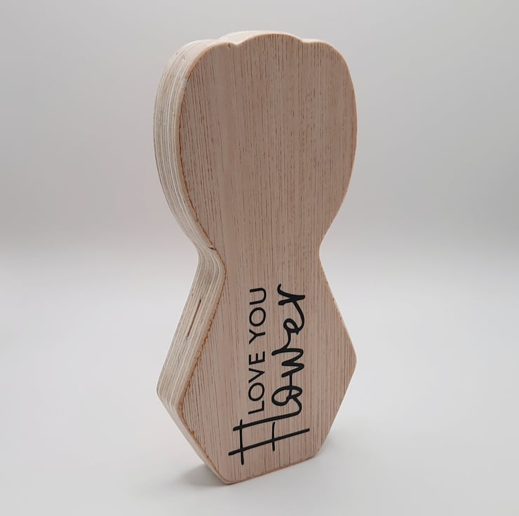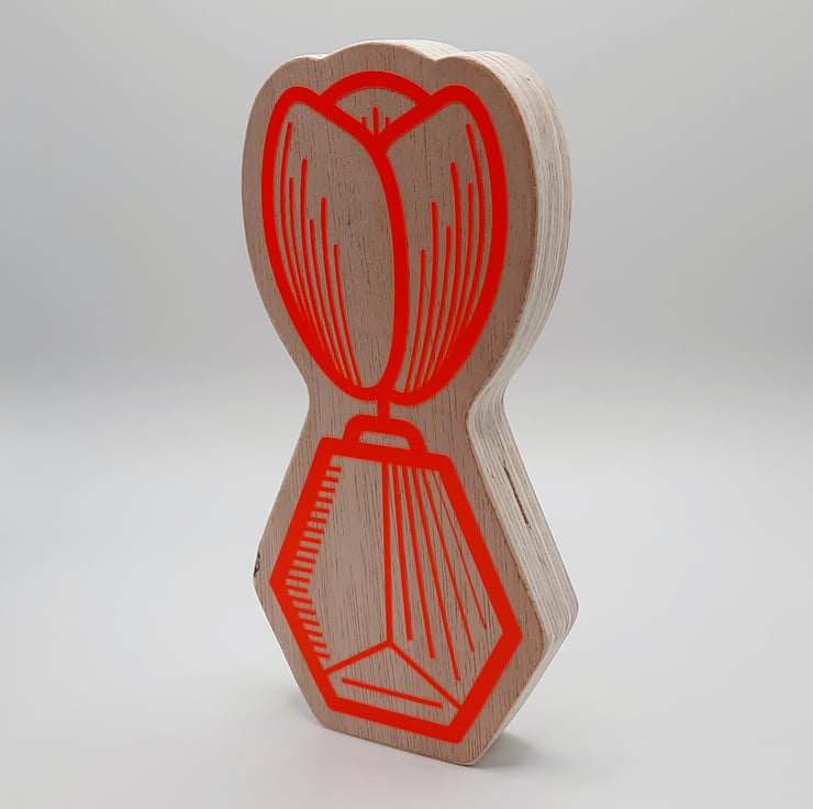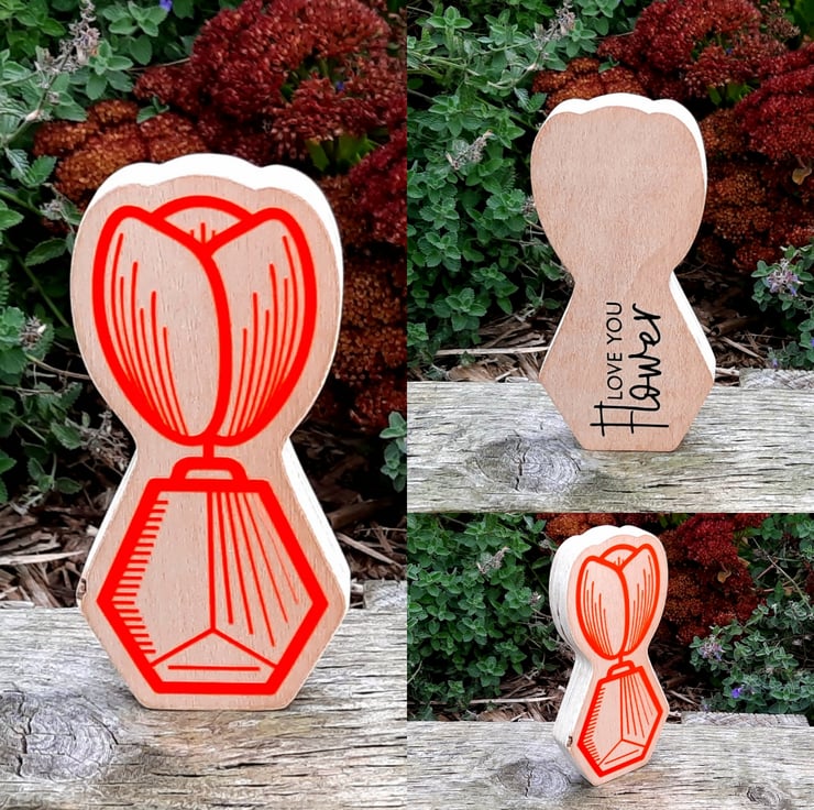 Your Tulip is individually handcut from offcuts of FSC certified Hardwood Ply and fine sanded by hand to a beautifully smooth natural wood finish. The illustration is precision cut out of Oracle 651 vinyl.