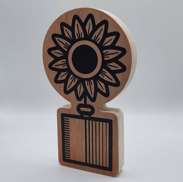 Your Sunflower is individually handcut from offcuts of FSC certified Hardwood Ply and fine sanded by hand to a beautifully smooth natural wood finish. The illustration is precision cut out of Oracle 651 vinyl.