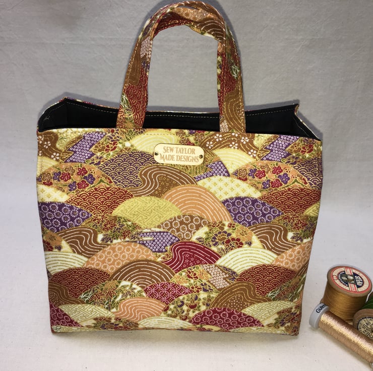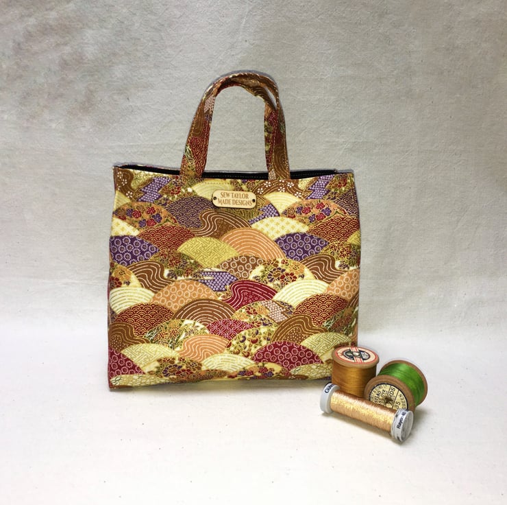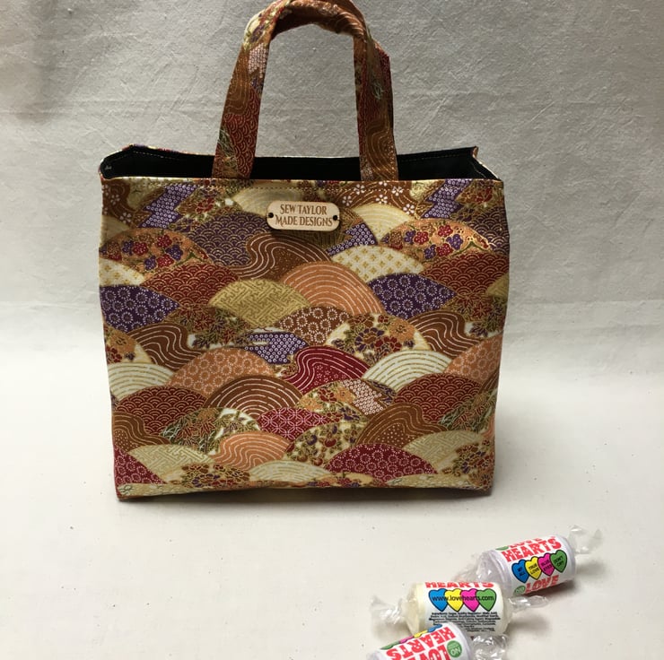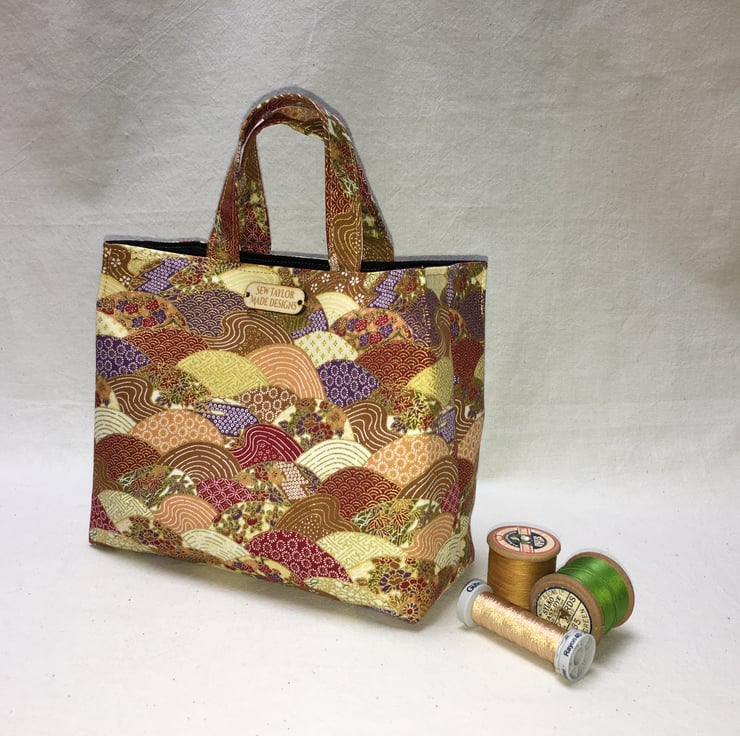 Stunning gold Japanese fabric patterned with waves in tones of red, umber, cream and purple has been used to create this stand out mini mini tote bag. The waves are patterned with white or gilding in a variety of Japanese patterns. Gold gilding provides the detail to this bag and makes it an exquisite fabric.