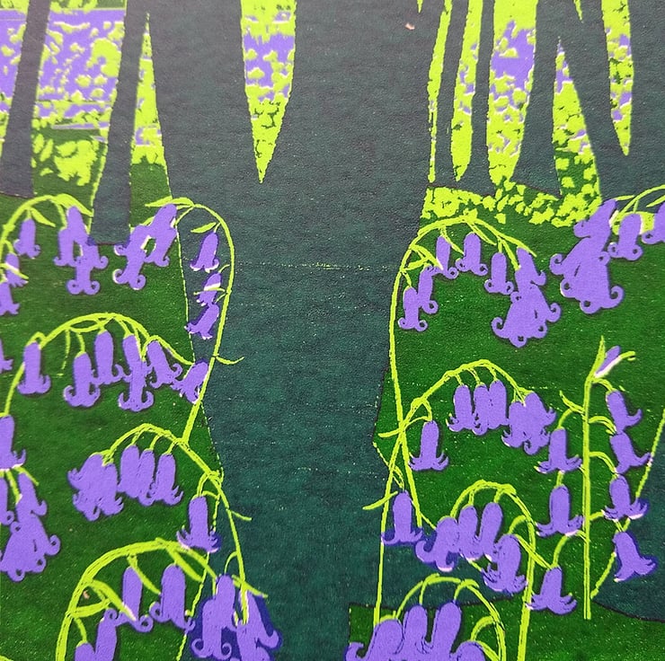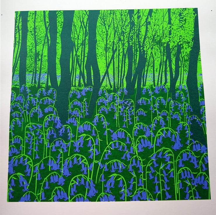 A hand-pulled screen-print called ‘Bluebell Wood’. It is a test print so has the guide marks near the edge of the print and a (terrible!) test print on the back. It also has a faint line on the tree as pictured.