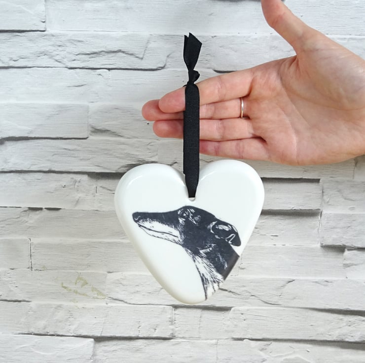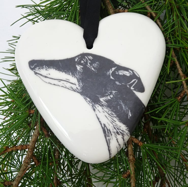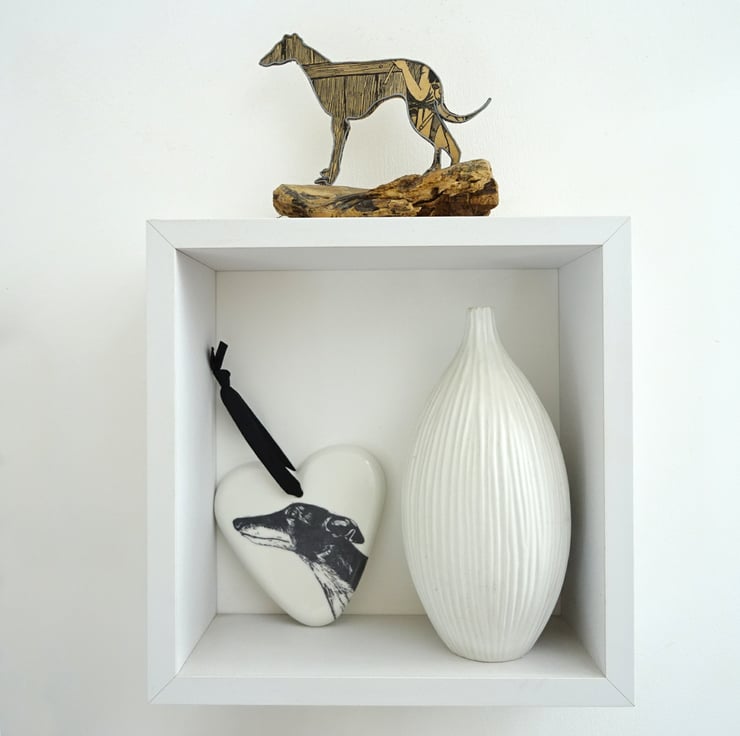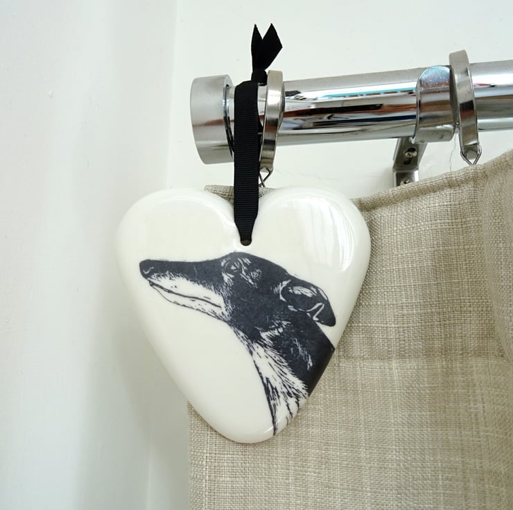 This stylish white ceramic heart is decorated with a gentle lino cut sighthound.