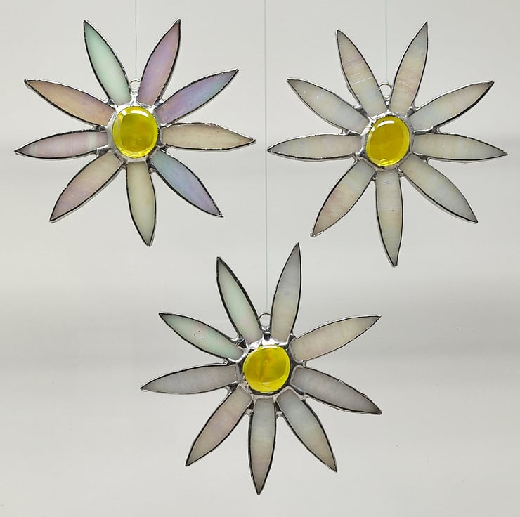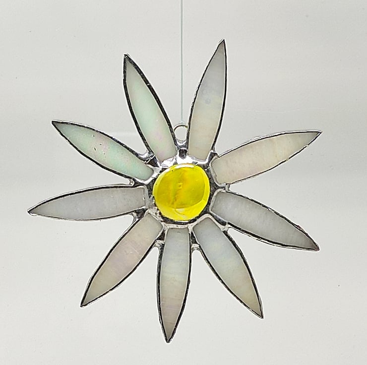 Stained glass iridescent white daisy copperfoil suncatcher