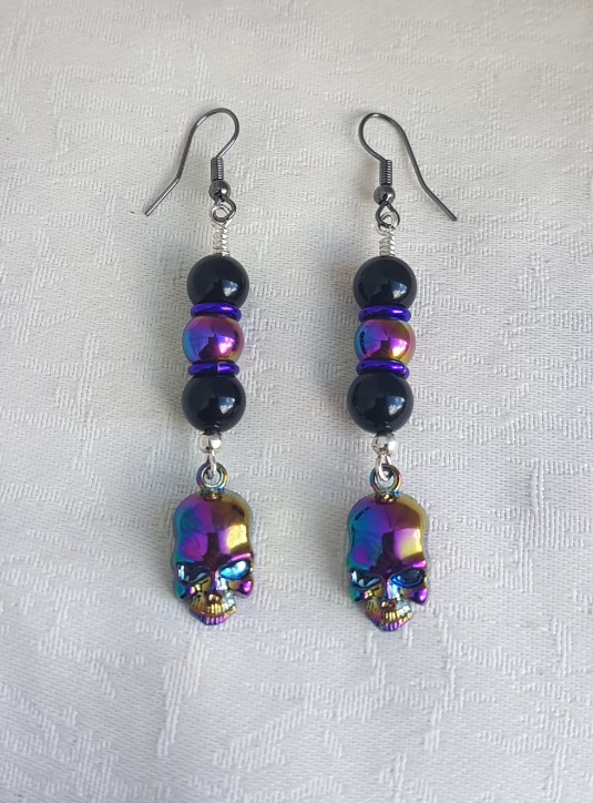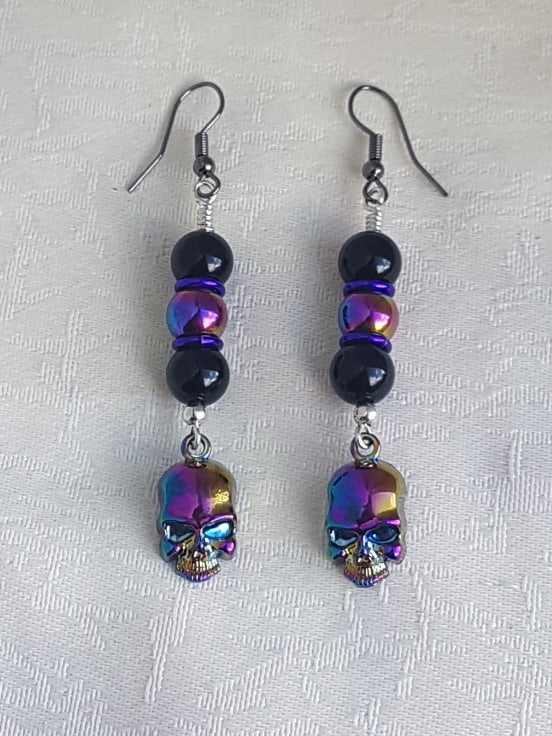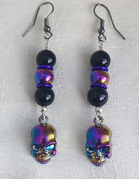 Rainbow Skull Earrings with Black Onyx and Rainbow Haematite Beads.