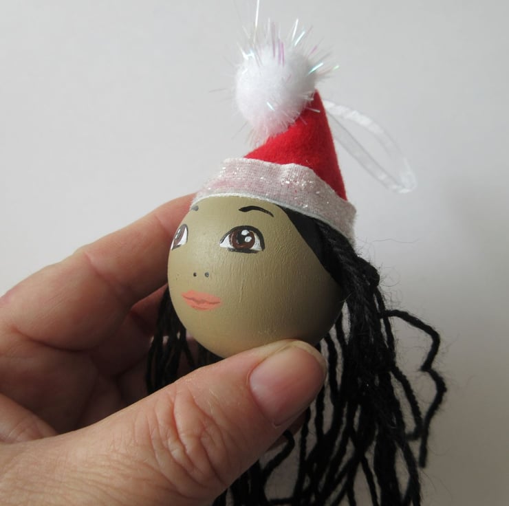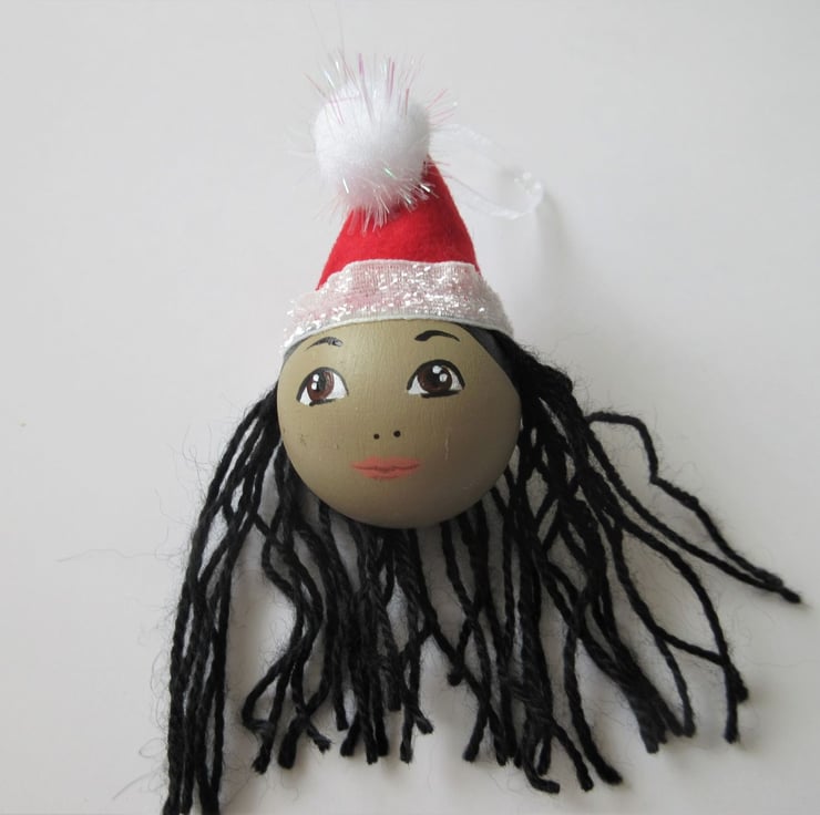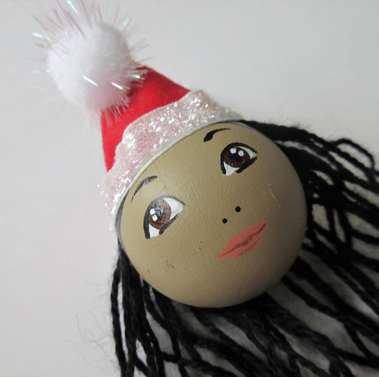 This is a hand painted wooden craft ball, complete with hand made mini Santa hat. Each of these baubles is completely unique.