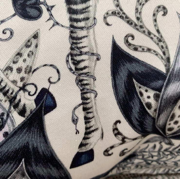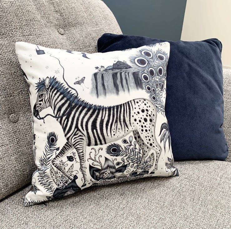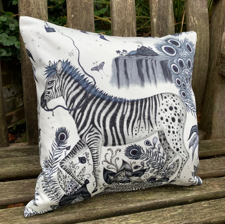 Lost World by Emma J Shipley cushion cover for a 16” /40cm square filler . This beautiful cotton fabric features a zebra with fascinating details all around - peacock feathers, snakes, dinosaurs - the more you look, the more you spot.
