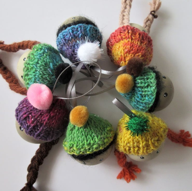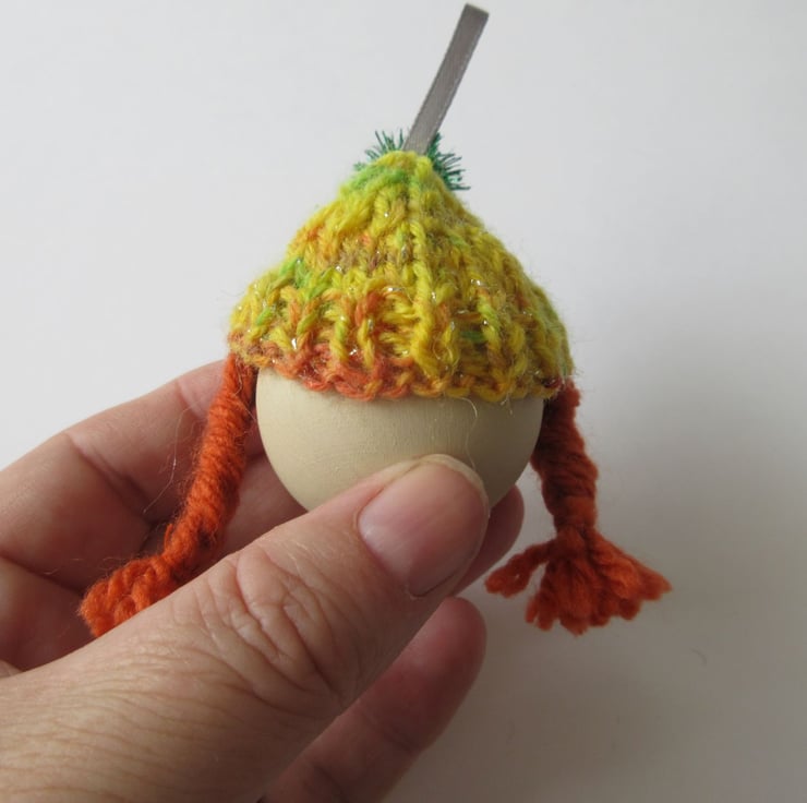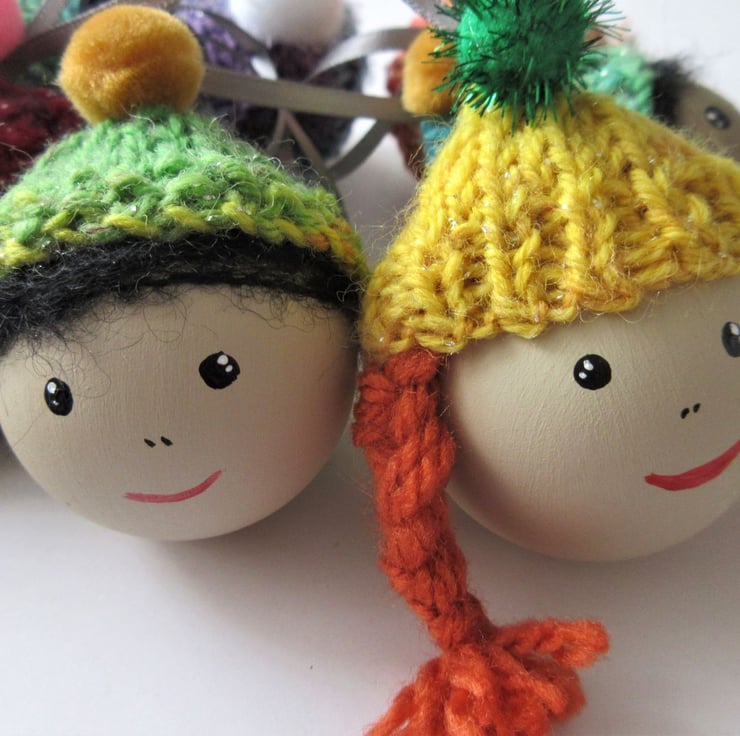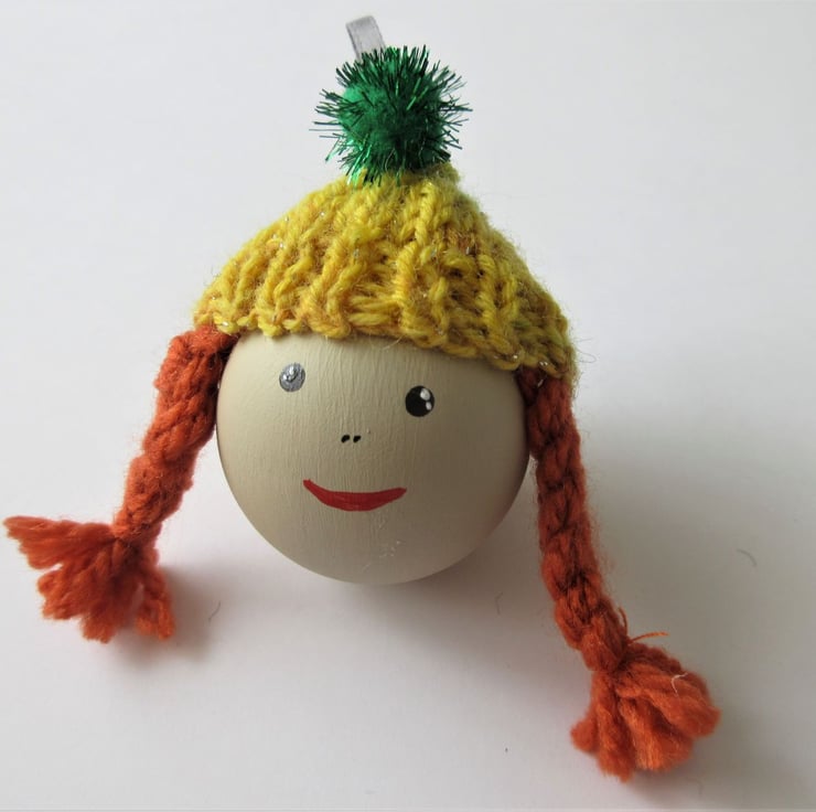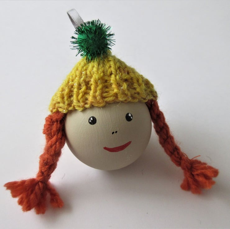 This is a hand painted wooden craft ball, complete with mini woolly hat. Each of these baubles is completely unique.
