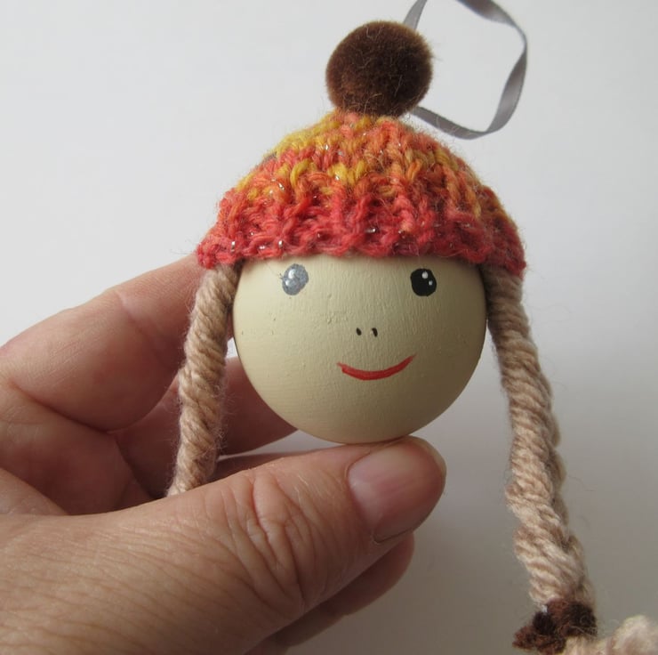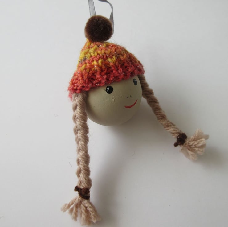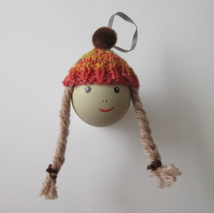 This is a hand painted wooden craft ball, complete with mini woolly hat. Each of these baubles is completely unique.