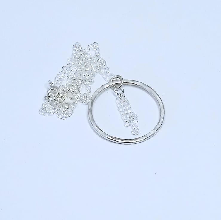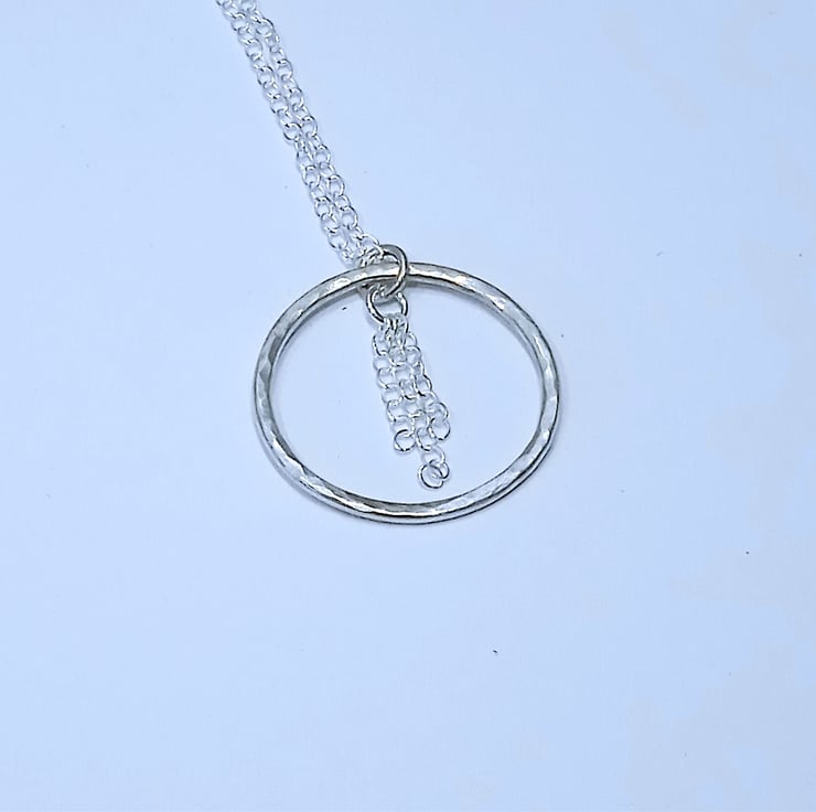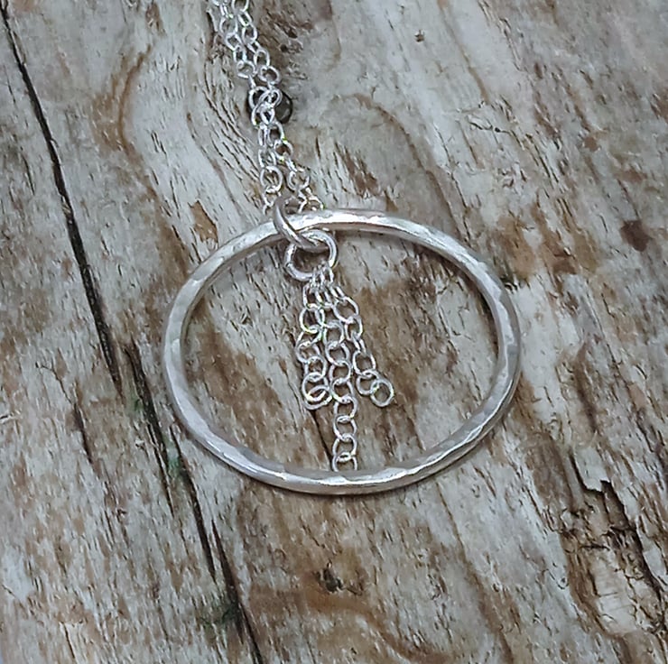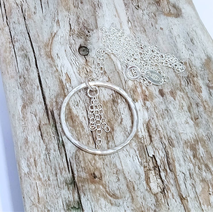 I have created the hoop from 1.5 mm sterling silver which I have soldered and hammered to create an attractive surface texture. Within the hoop I have hung sterling silver chain to create an elegant effect. The hoop measures approximately 24.5 mm across.