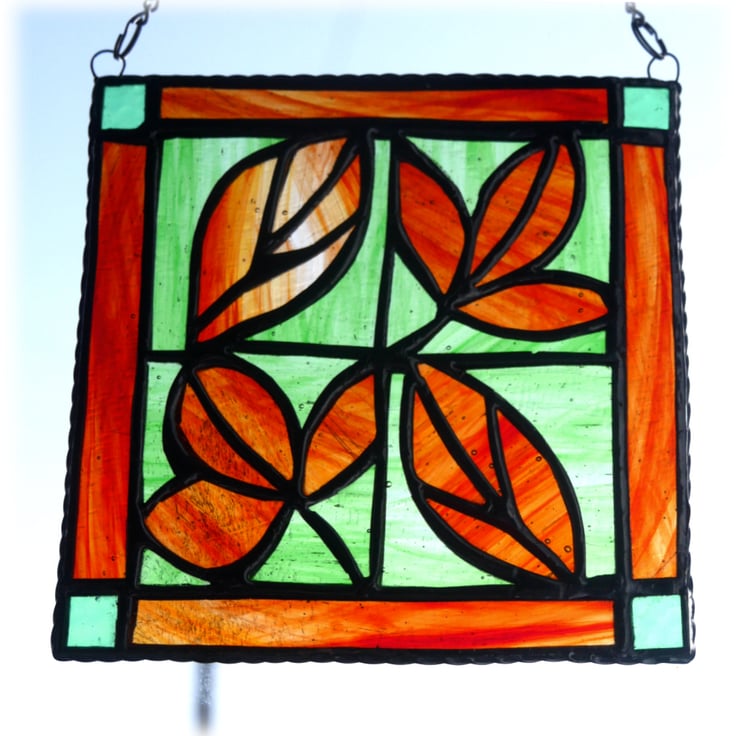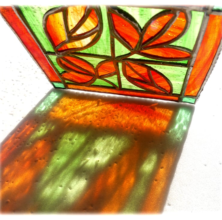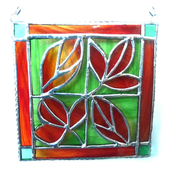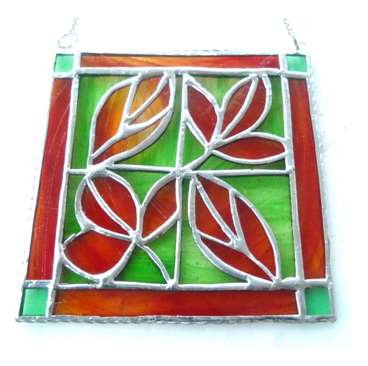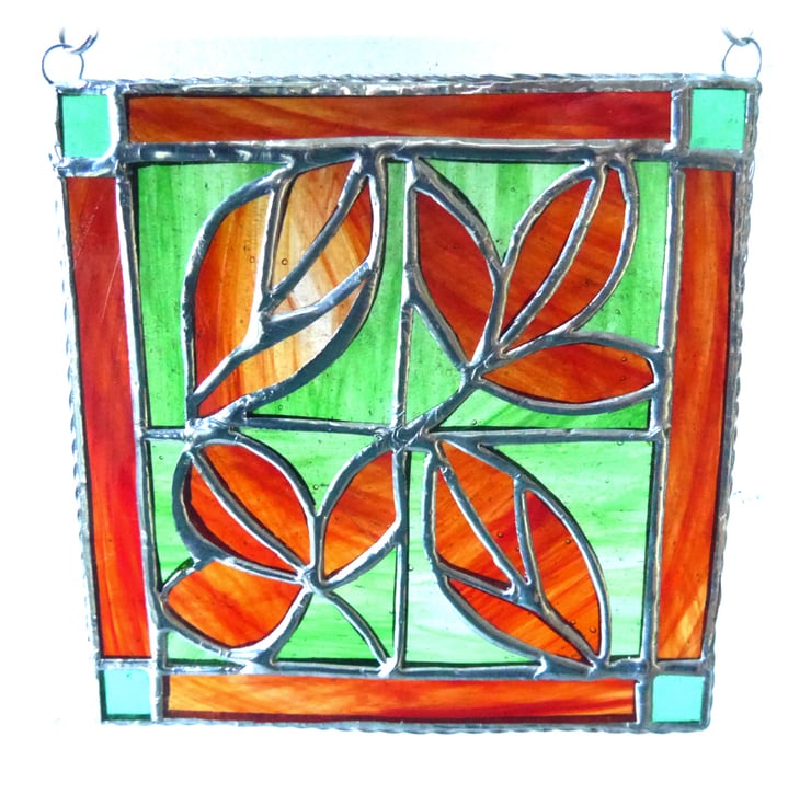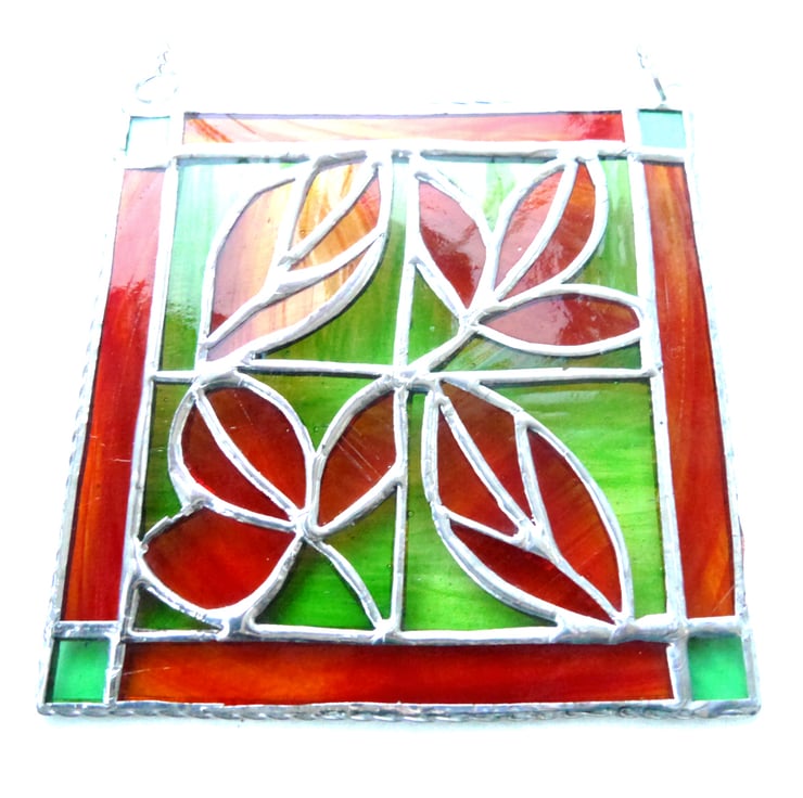 The last photo shows a red, autumnal leaf suncatcher together with a green version also for sale as a separate listing.