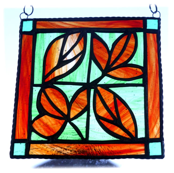 I've made 4 little square tiles cut from streaky green glass which surrounds an autumnal leaf, each leaf is cut from a very streaky variety of red and amber glass.