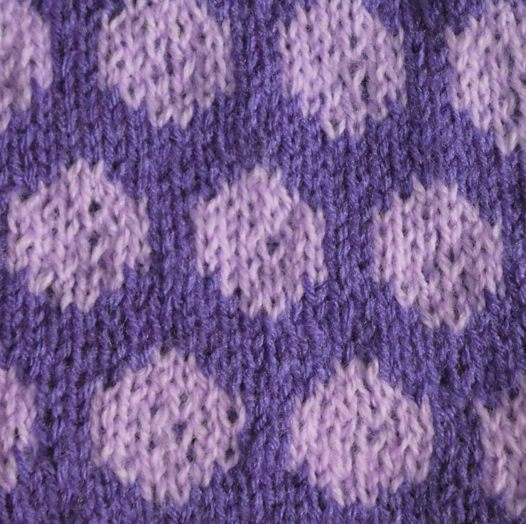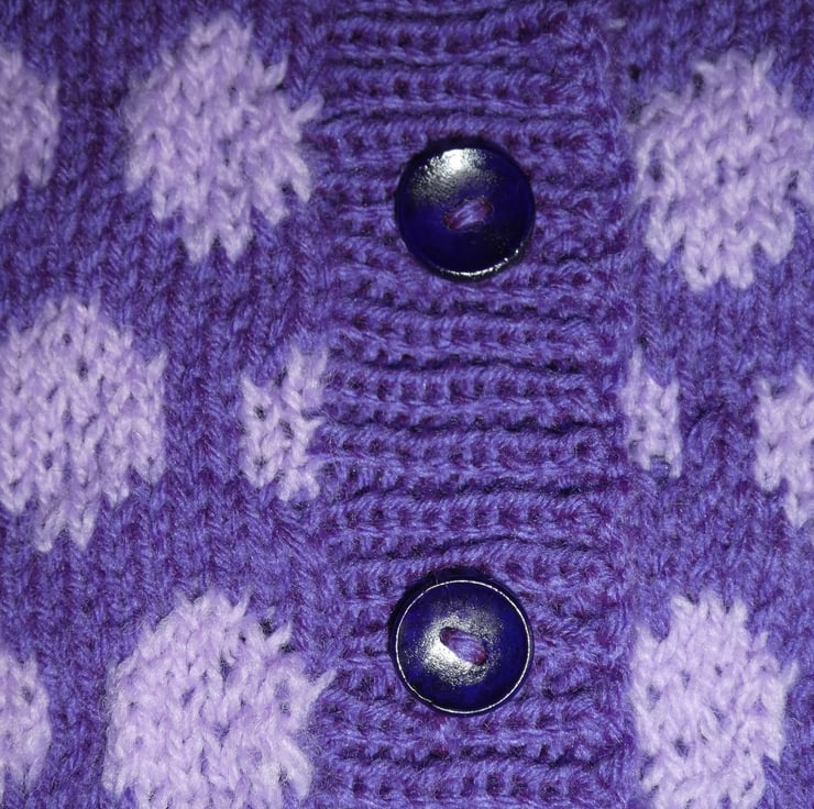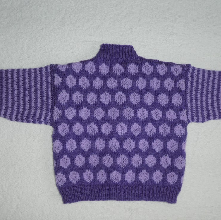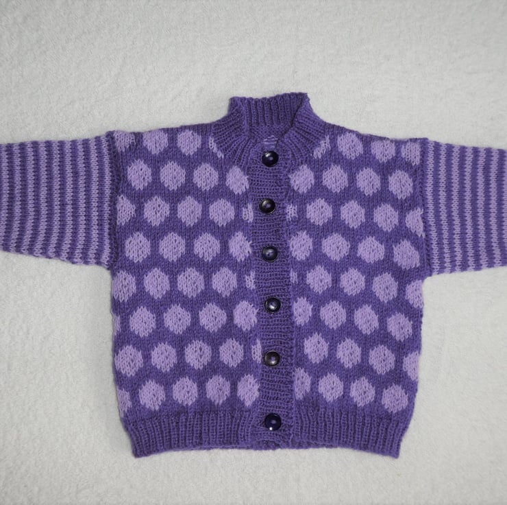 This eye catching cardigan has been hand knit with large polka dots on the body, and stripped sleeves. The fronts and back are knit as one piece in a fair isle circle design, then joined at the shoulder seam, with neckband and front bands knitted on after. The sleeves are knitted in stripes. The yarn is 4 ply acrylic.
