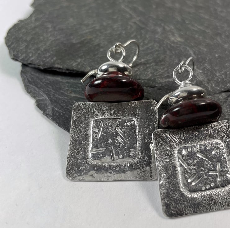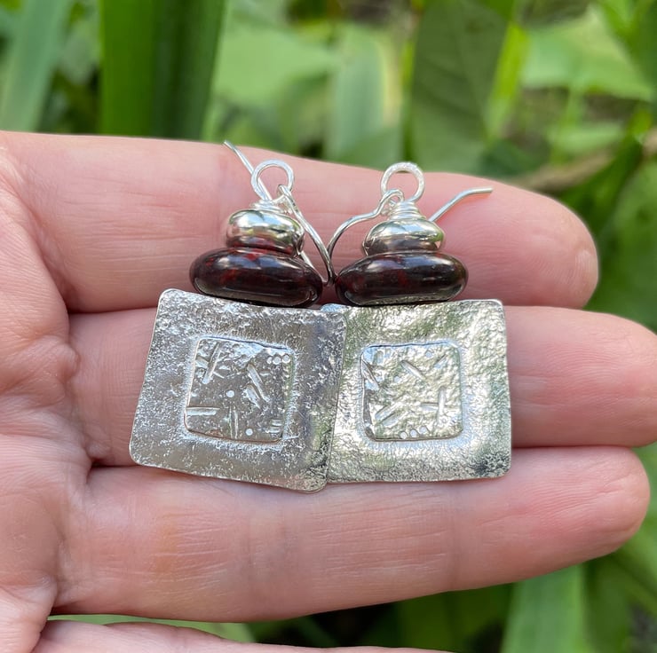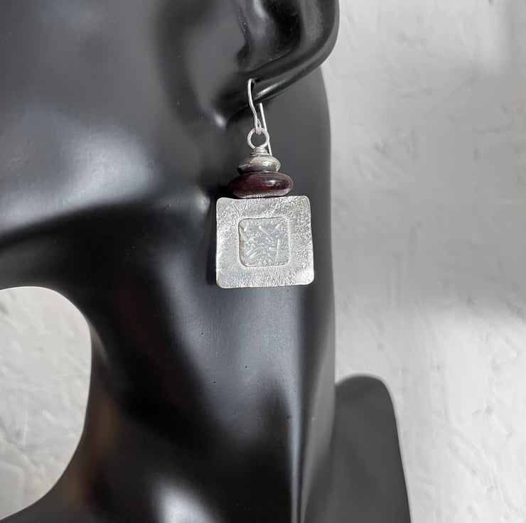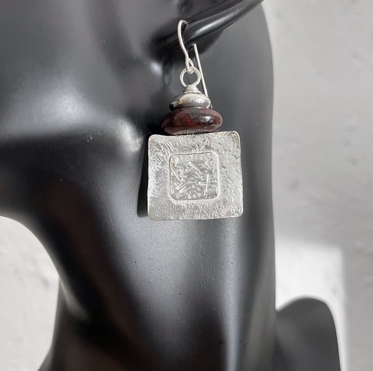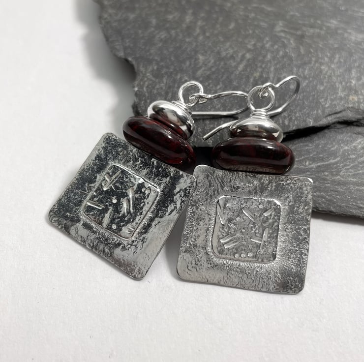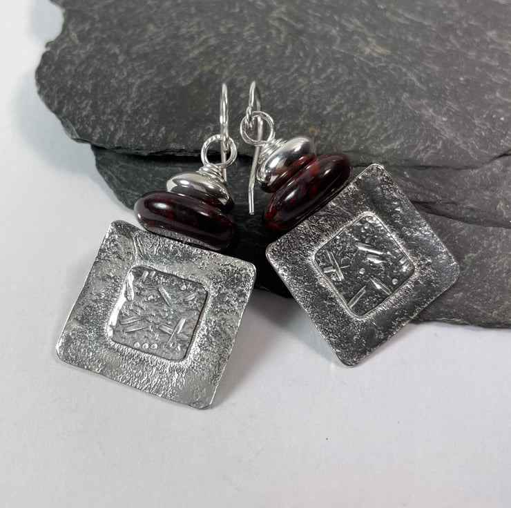 Squares of silver have been fused and I have a punched random glyph pattern in the centre. They are topped with beads and hang from a hook ear wire.