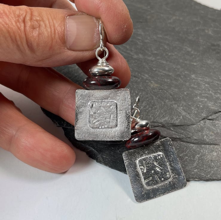 Square silver earrings topped with red flame Jasper disc beads.