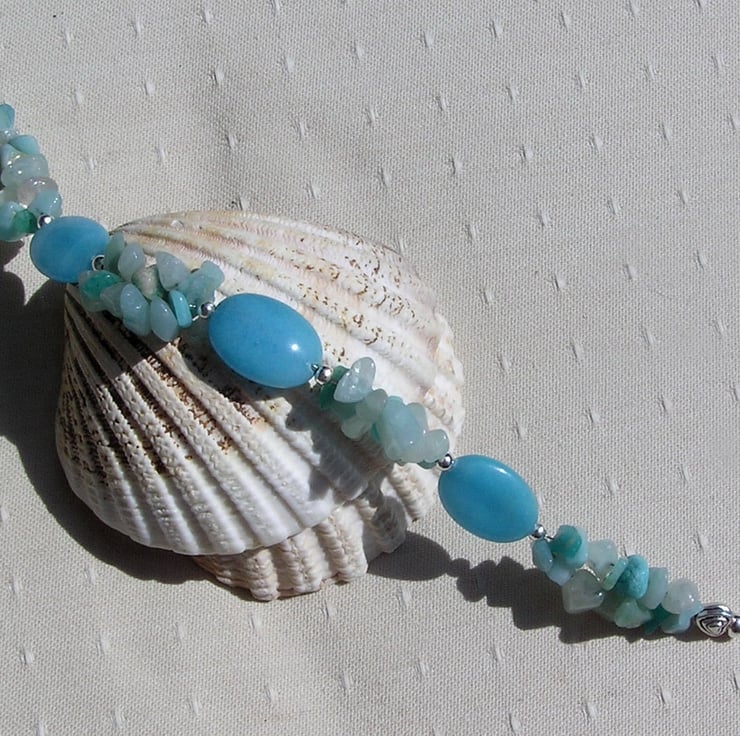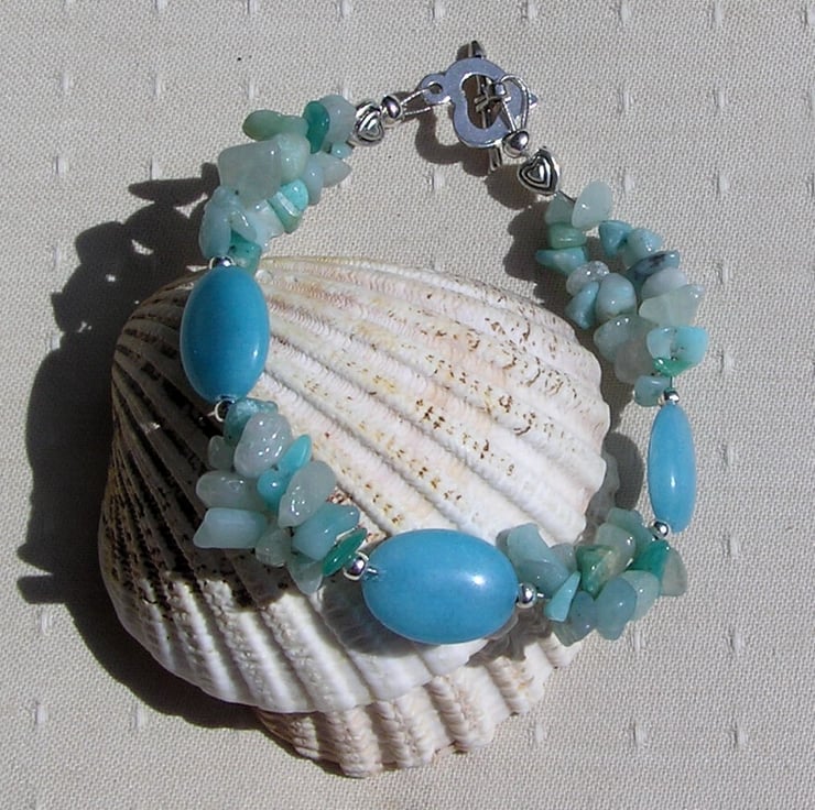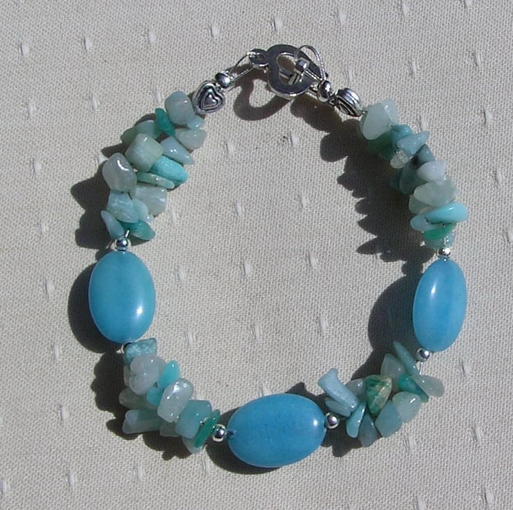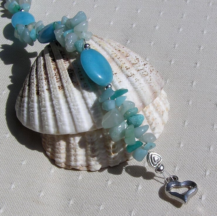 This Stunning Bracelet is made wholly from Amazonite.. three Turquoise Blue/Green Oval shaped beads separated by double-stranded Pale Green Amazonite Gem-Stone Chips with a tiny Silver Heart at each end - a Beautiful combination that will look stunning either worn casually or with something more Elegant for a Special Evening out