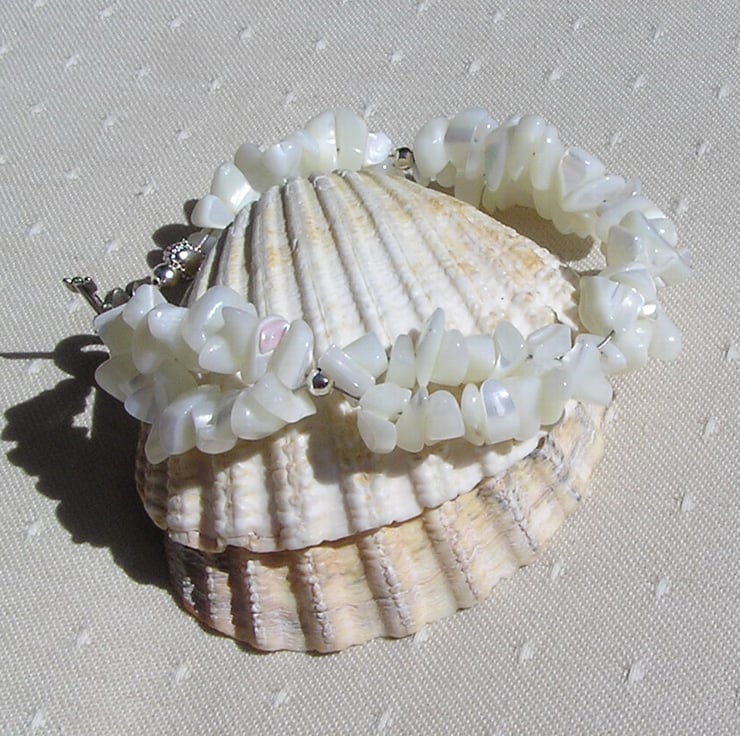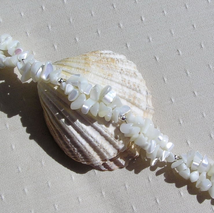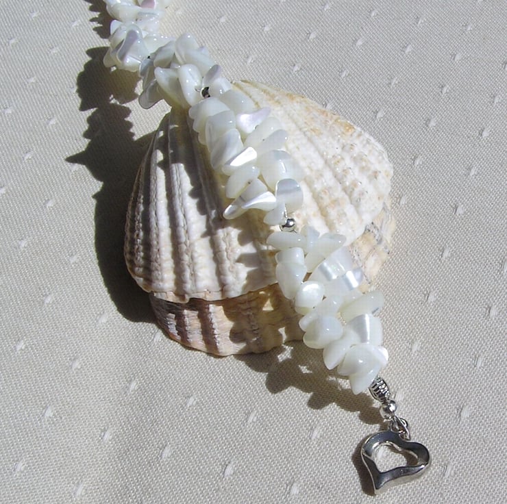 This Stunning Bracelet is made wholly from White (Cream) Mother of Pearl – Double stranded Gem chips separated into short sections by Sterling Silver spacer beads with a tiny Silver Heart at each end - A Dreamy combination