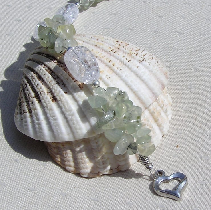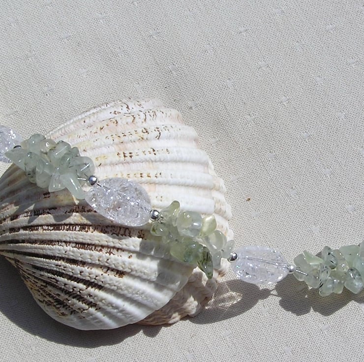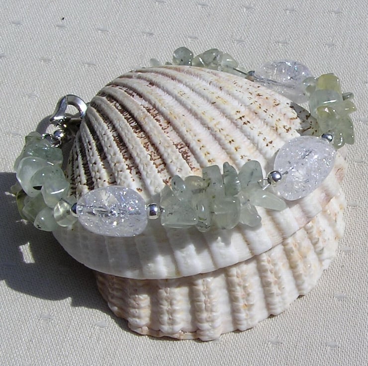 This Stunning Bracelet is made from three Chunky Crackled Quartz Nuggets separated by double-stranded Prehnite Gem Chips along with tiny Sterling Silver spacers - a Beautiful glistening combination that will look stunning either worn casually or with something more Elegant for a Special Evening out