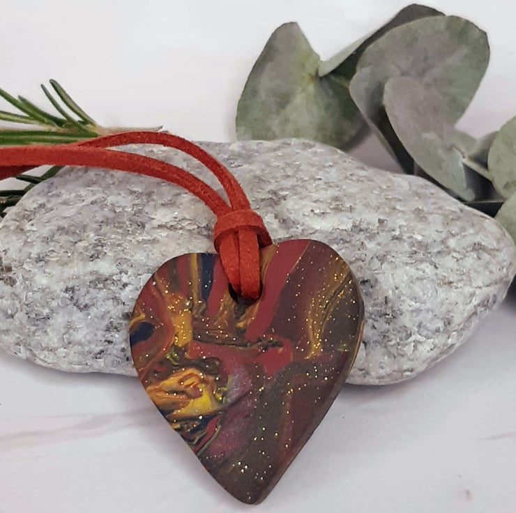 Heart shaped pendant handmade from a blend of brick red, bright green, navy blue and glittery golden yellow polymer clay creating a unique swirl pattern with a hint of sparkle