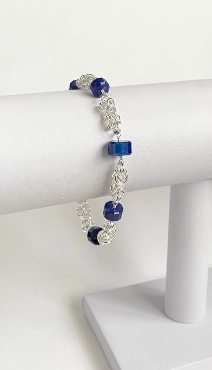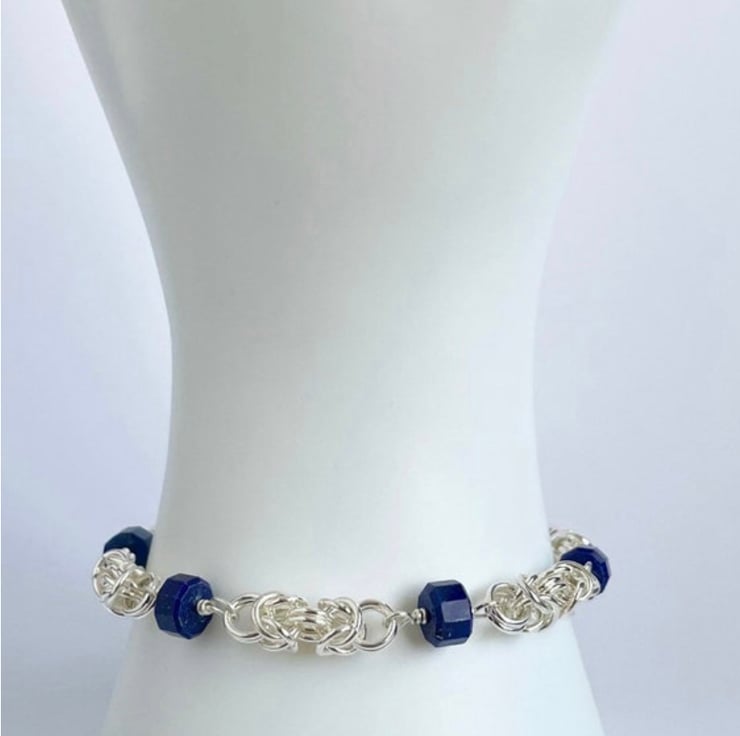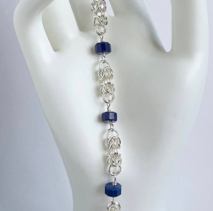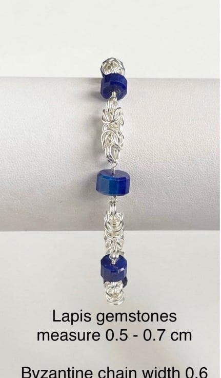 The chain sections are chainmaille which are made with sterling silver rings that have been weaved into this lovely byzantine chainmaille pattern. There are 6 chainmaille sections in the bracelet interspersed between 5 lapis lazuli gemstones.