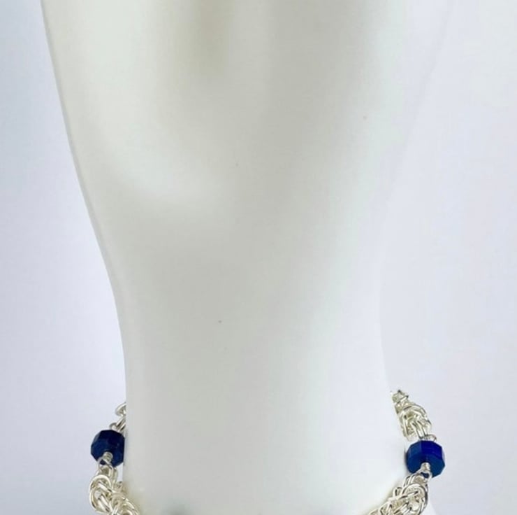 This is a beautiful one of a kind sterling silver lapis lazuli chainmaille bracelet.
