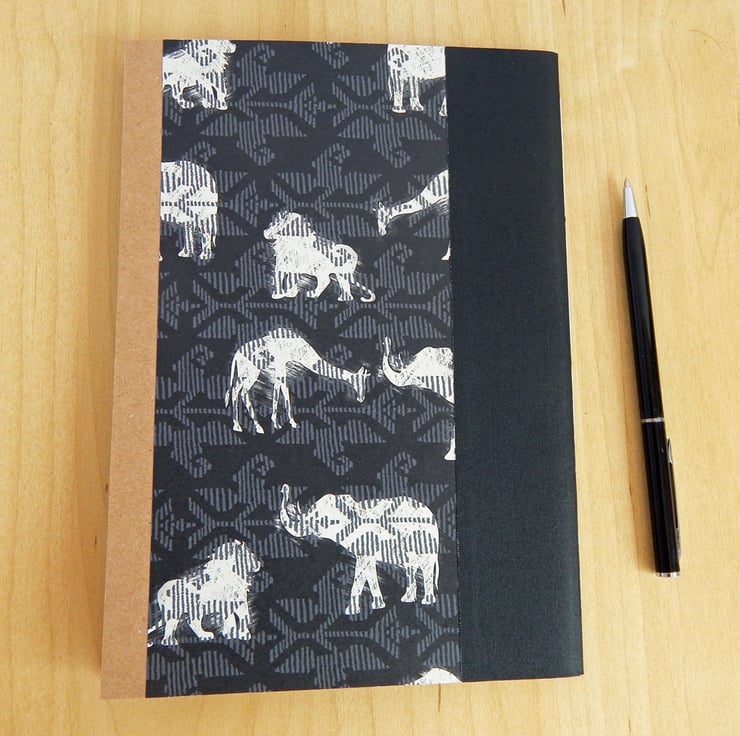 A5 notebook with kraft covers decorated with African animal design paper and a black cloth spine trim, to resemble a traditional book. Inside are pages of white 100gsm lined paper.
