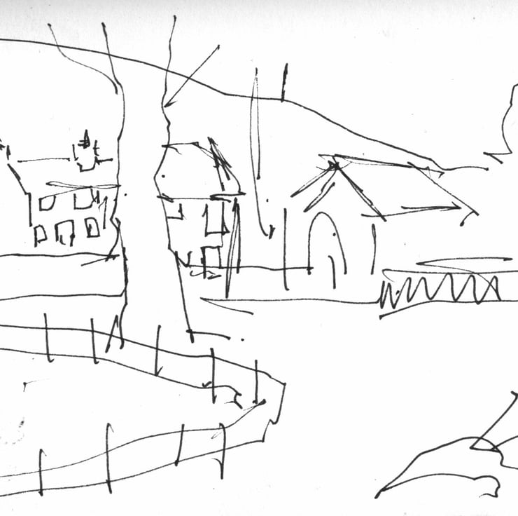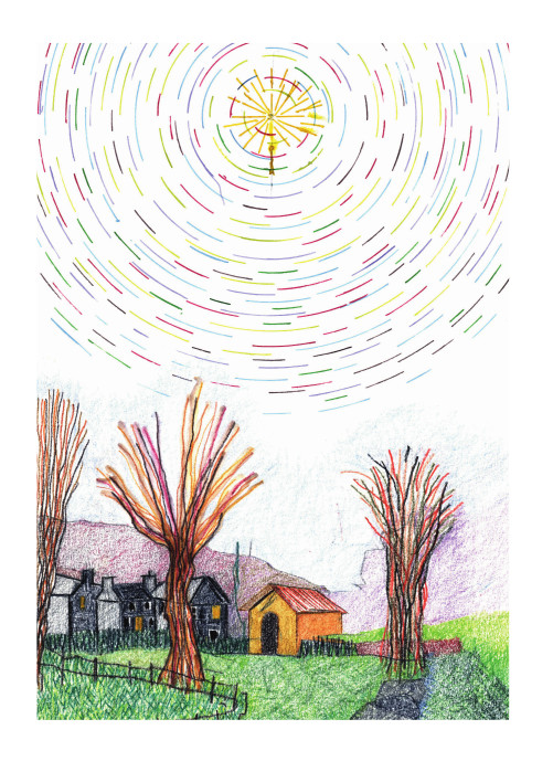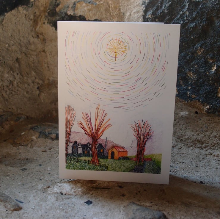 I drew the original sketch when we visited Blanchland in Northumberland at the end of December 2014. I remember there was light snow on the ground and it was icy underfoot and it occurred to me then that I might like to develop this image into something more imaginative. Nearly eight years later I took the plunge to design a series of four Christmas cards based on sketches in the north of England into Christmas cards with a wintry theme.