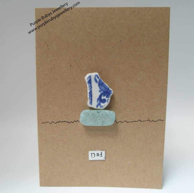 A cute Dad/ Fathers Day card featuring a blue & white sea pottery ship, with a hand stamped 'Dad' plaque underneath.
