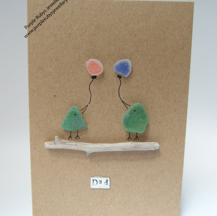 A cute card featuring two green sea glass birds on a drift wood perch, with red & blue balloons, with a hand stamped 'Dad' plaque underneath.