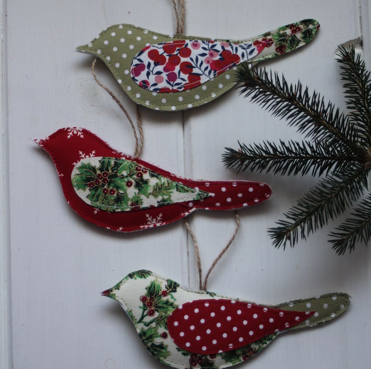 A set of three lightly padded hanging bird decorations made from oddments of floral festive fabric in shades of reds, greens and creams.