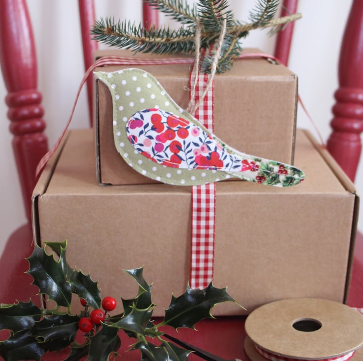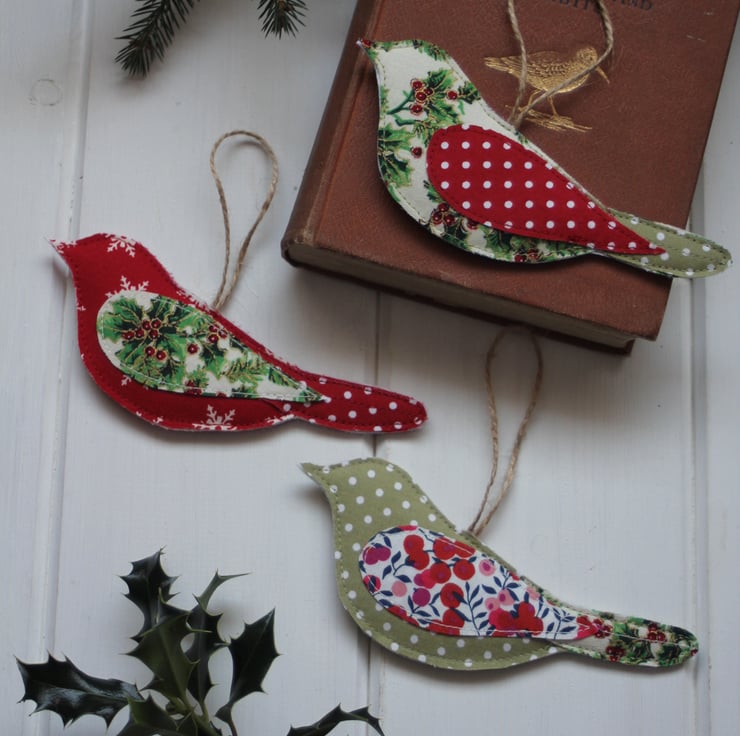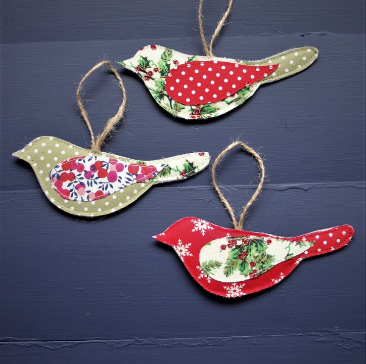 Each bird has been created from odds and ends of leftover fabric and measures approximately 14cm from beak to tail. Each one is double sided and made from three different co-ordinating patterns which have been cut out by hand. They contain a layer of polyester wadding to create a padded effect and have a hanging loop made from garden twine.