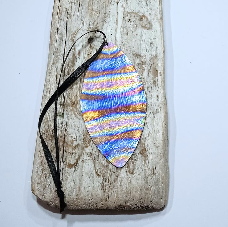 I have created this decoration by hand sawing the bauble shape from titanium sheet. I've given the surface an attractive hammered finish before heat colouring to create a unique finish.
