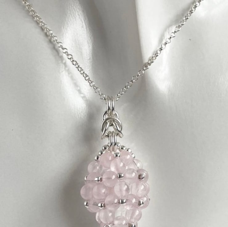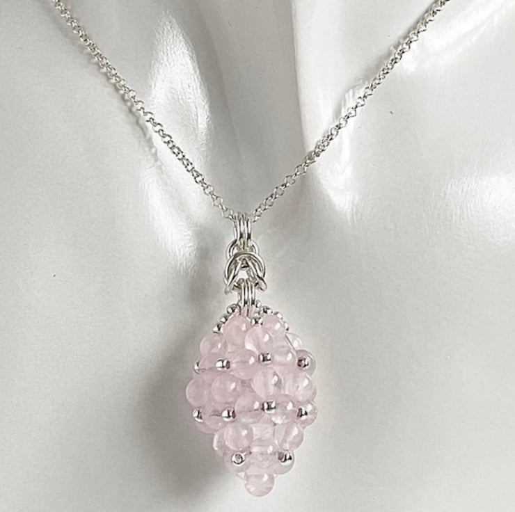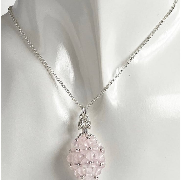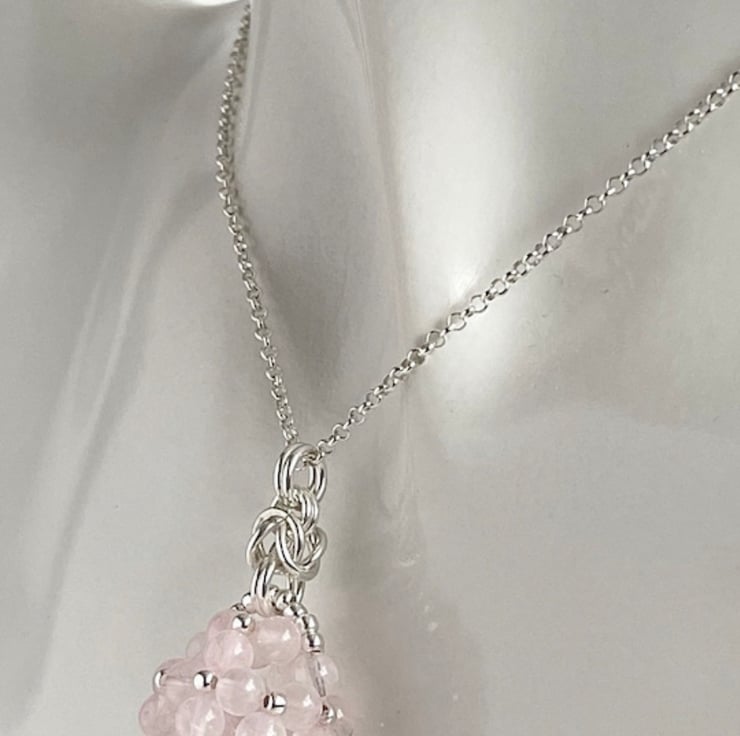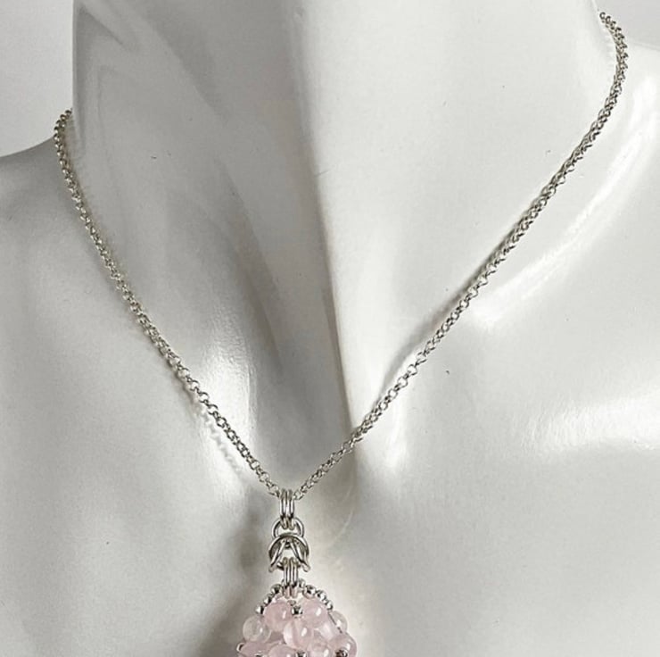 This is an eye catching beautiful pendant made with Rose Quartz gemstones and sterling silver round beads.